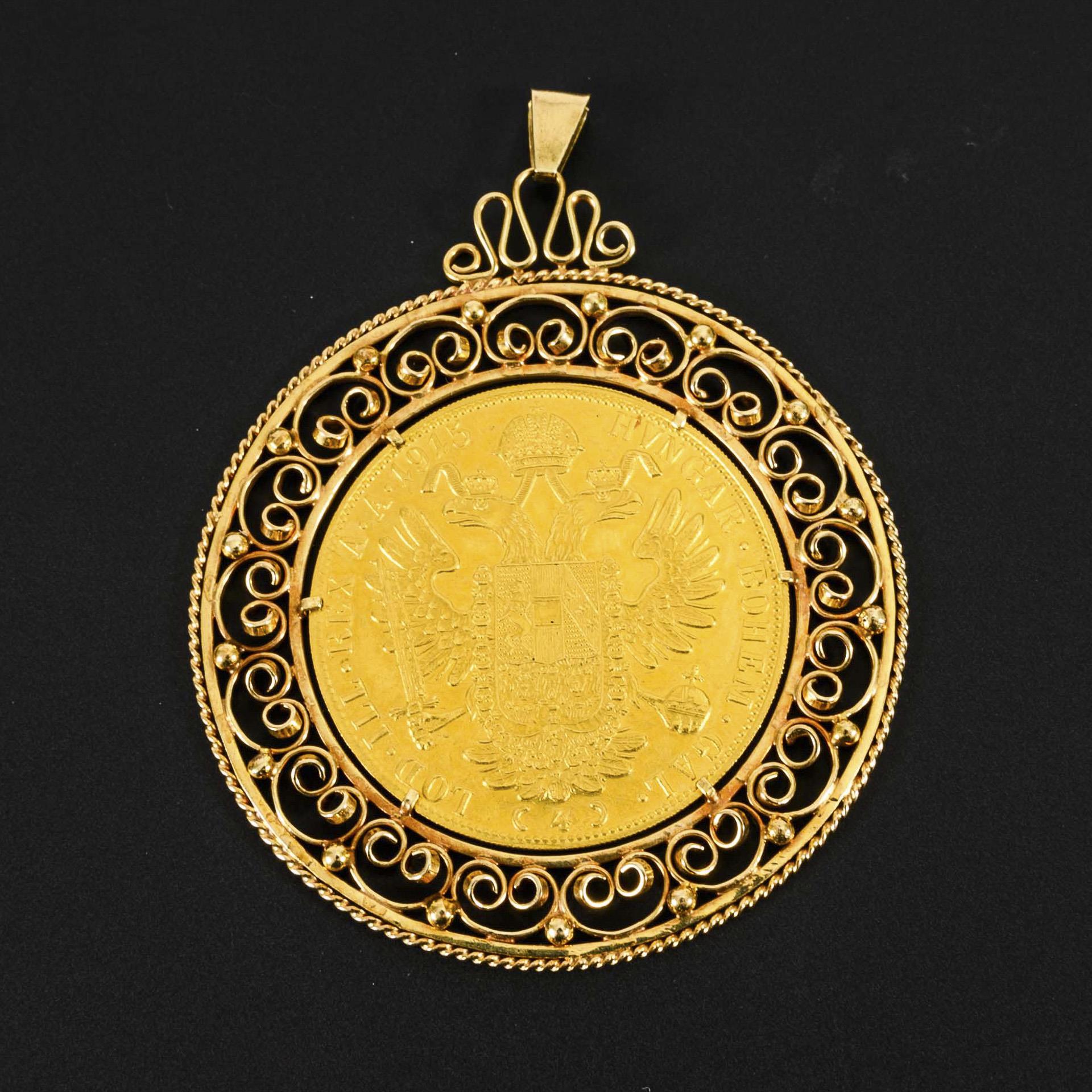 Large coin pendant 4 ducats Austria, in filigree frame.