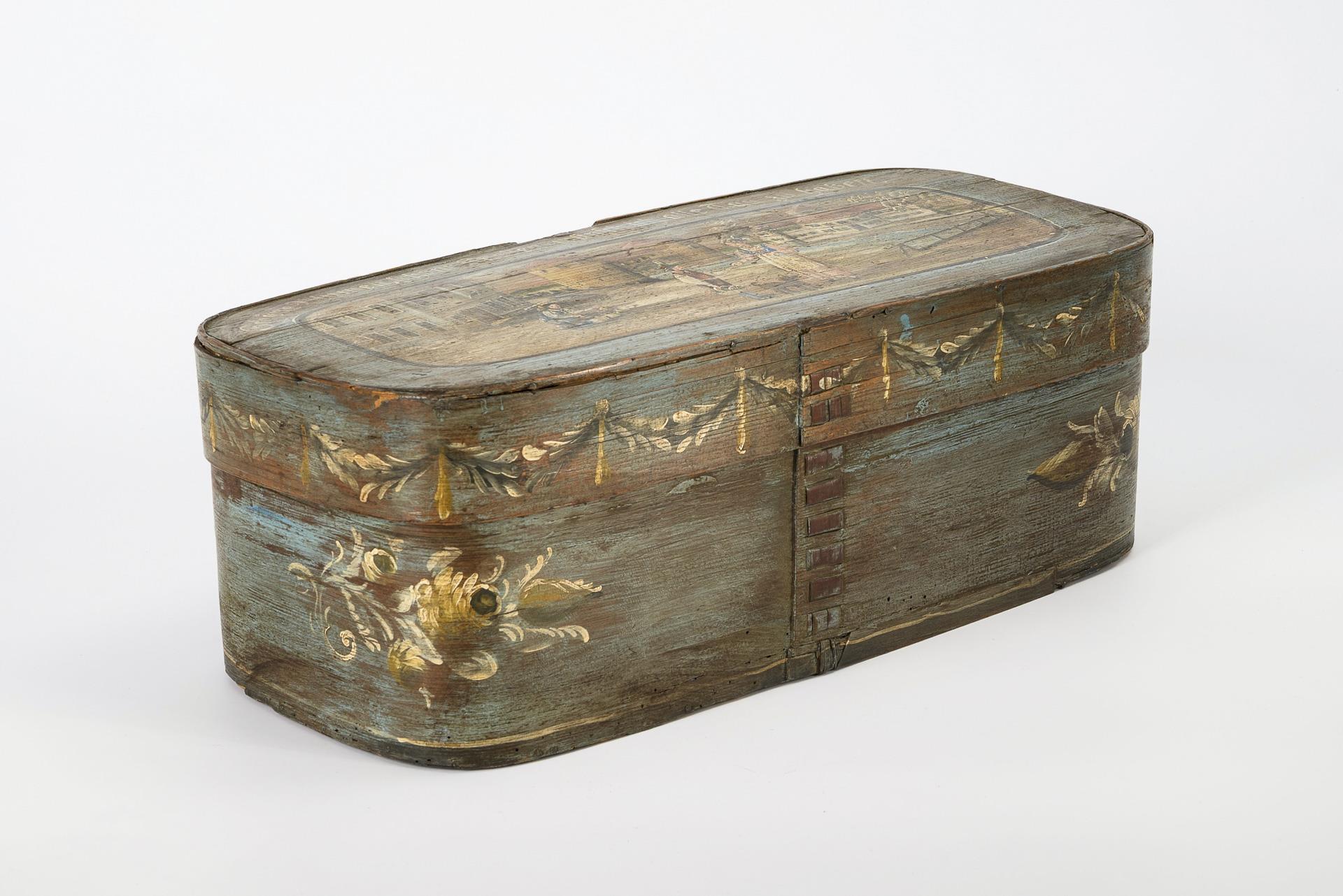 Oblong box with light blue background. Flowers and surrounding garland on the wall. On the passport cover, flower seller in the city by the river and the motto "Schöne Blumen, schöne Knaben wünsch ich alle Tag zu haben". Minor traces of wear and chips, some dry tears.