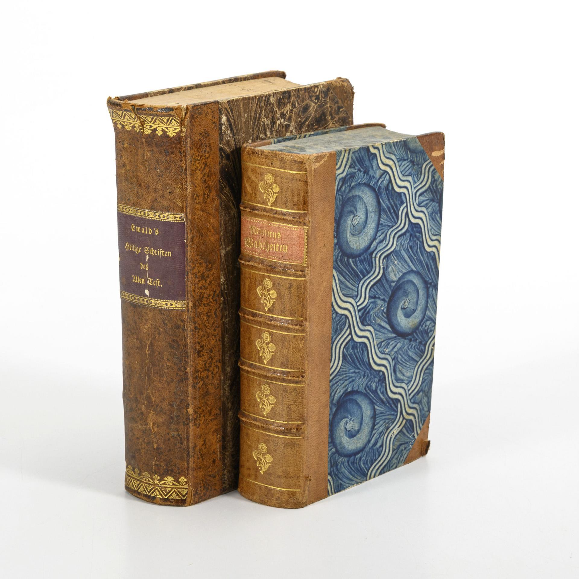 Ewald: "Die Heilige Schrift des Alten Testaments in Hundert Biblischen Kupfern dargestellt", Freiburg in der Herderschen Kunst und Buchhandlung. On the cover: "Inherited from the dear immortalized mother. Sophie Landgräfin zu Hessen Philipsthal Barchfeld", 491 pages in half leather binding / "Hermann Samuel Reimarus. "Die vornehmsten Wahrheiten der natürlichen Religion in zehn Abhandlungen ...", Hamburg 1772, by Johann Carl Boehn. 4th improved and greatly enlarged edition. (14), 766, (26) pages. Owner's note: "Julie Wilhelmine Pr. zu Sl. Ho. Glücksburg". In half leather binding.