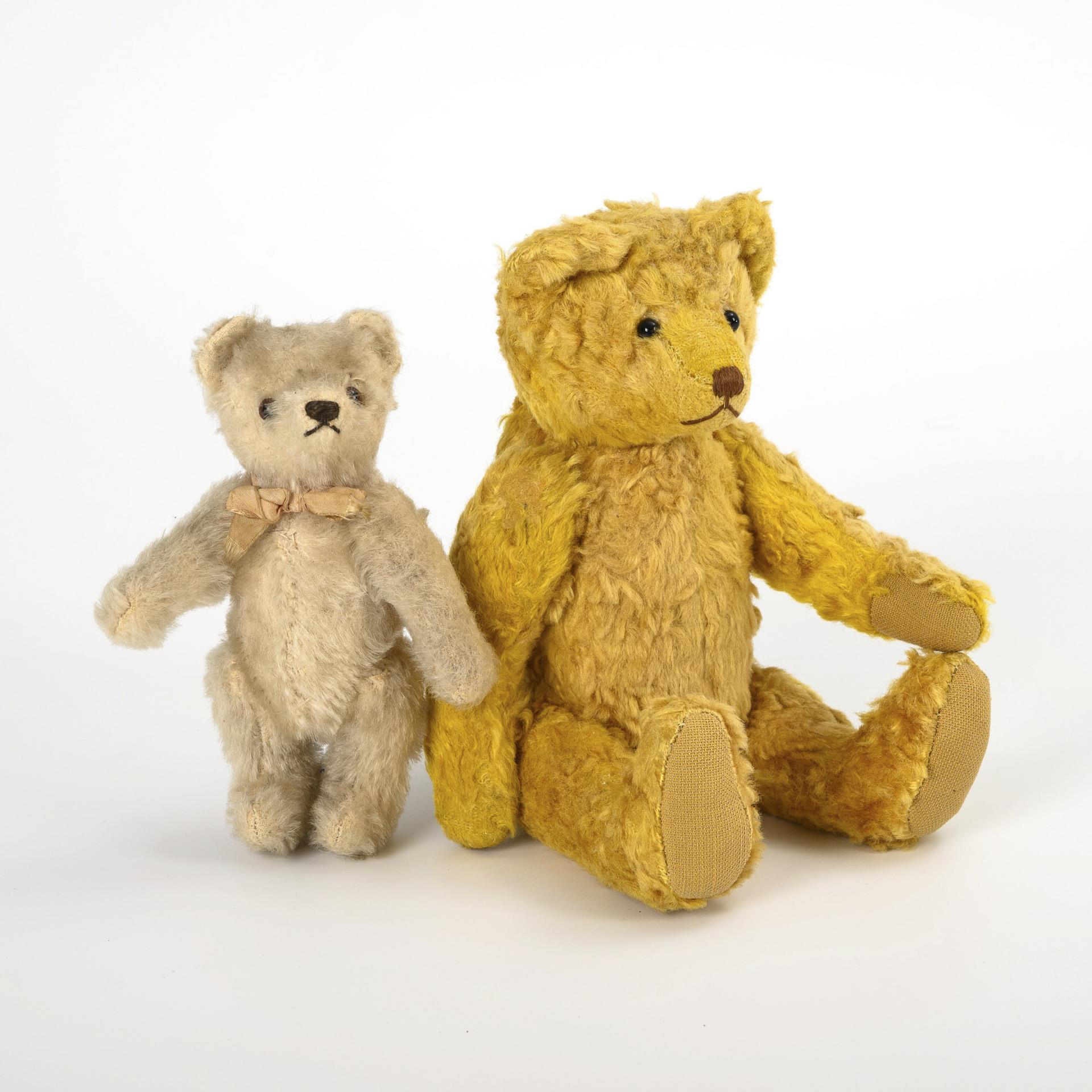 Yellow artificial plush teddy bear, L 24 cm. / Small white mohair teddy bear by Steiff, l 14 cm. Slight signs of age.