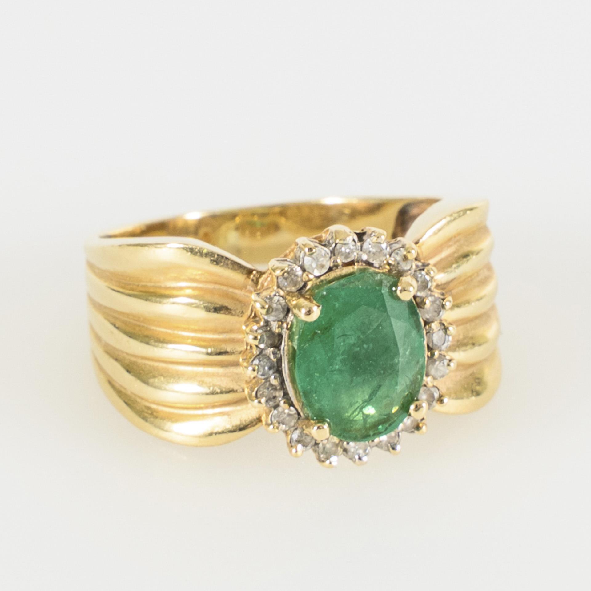 On a very wide wide shank, an entourage element with a large, oval green stone, likely an emerald surrounded by small brilliant-cut diamonds. Slight signs of wear, one edge of the emerald chipped.