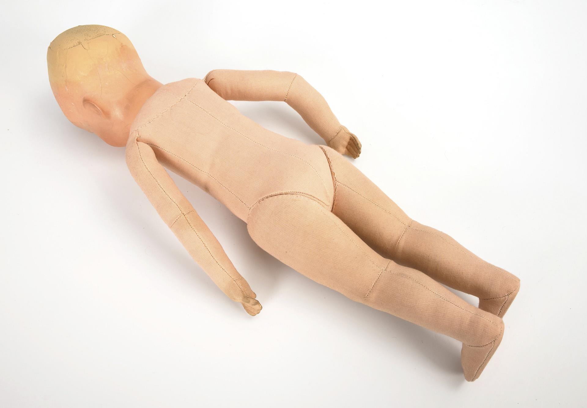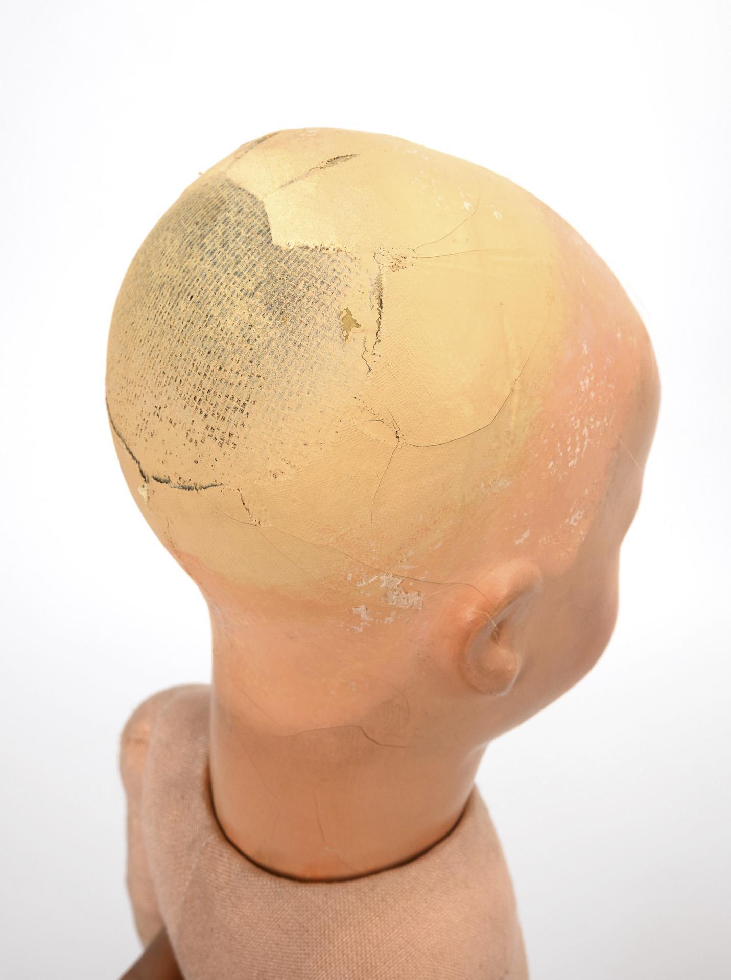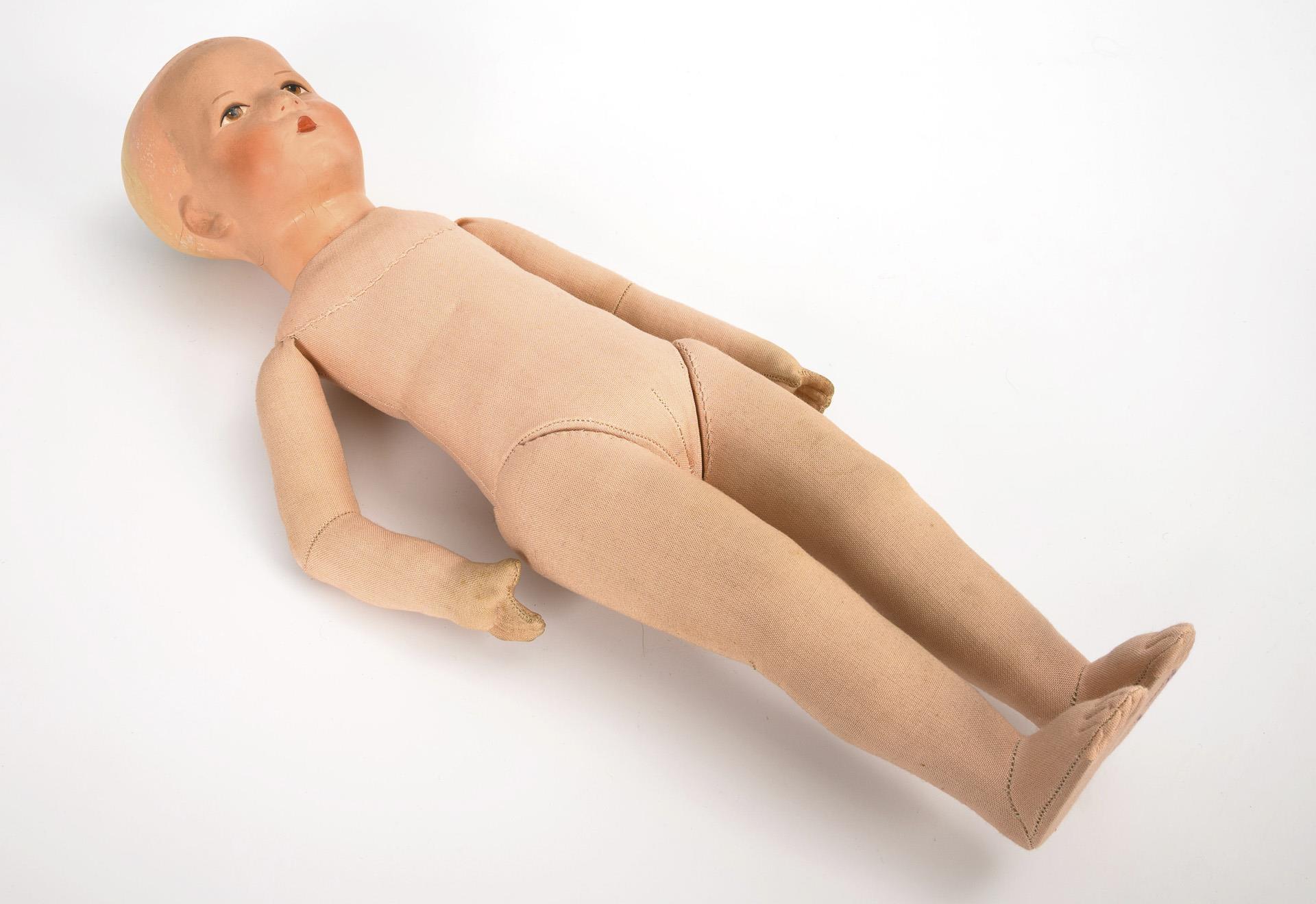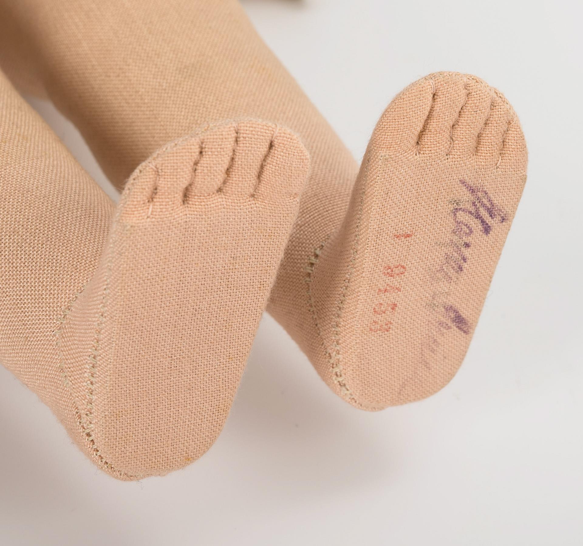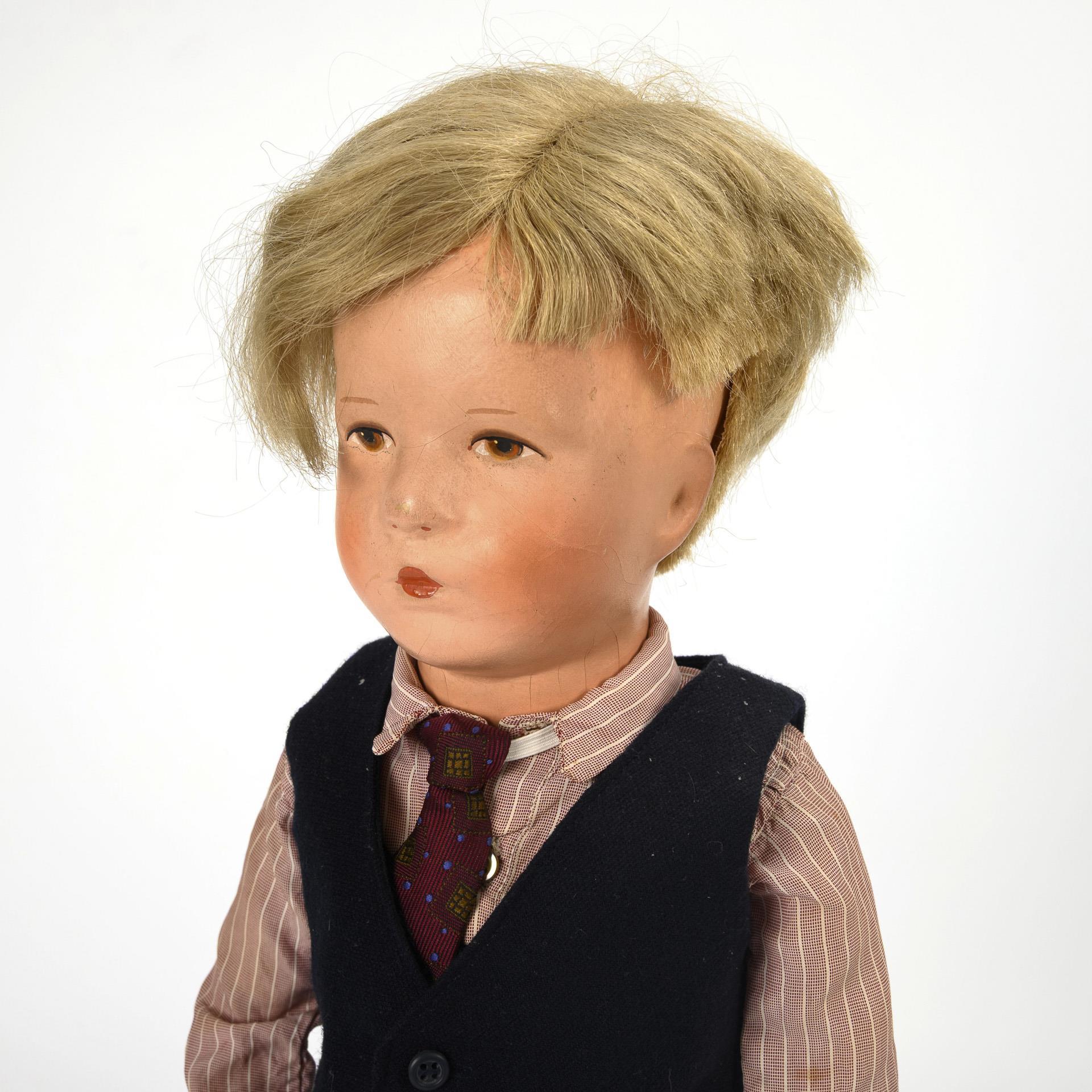 Type VIII. Fabric-covered crank head with painted brown eyes, removable blonde human hair wig. Cloth body with dangling arms, legs with disk joints. Dark blue suit with vest and shorts, white oilcloth shoes. Small color defects and craquelure on the face, retouched lips.