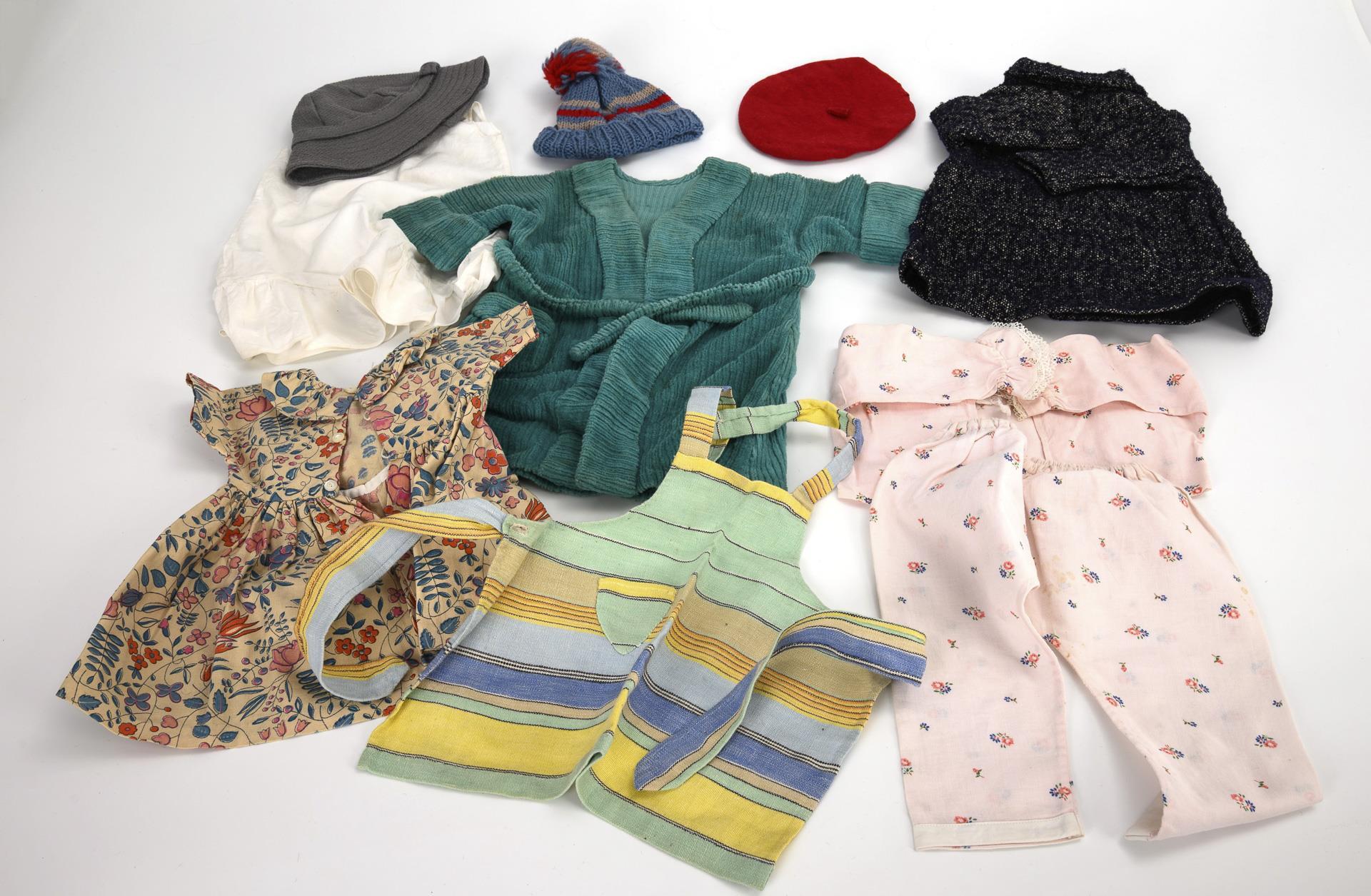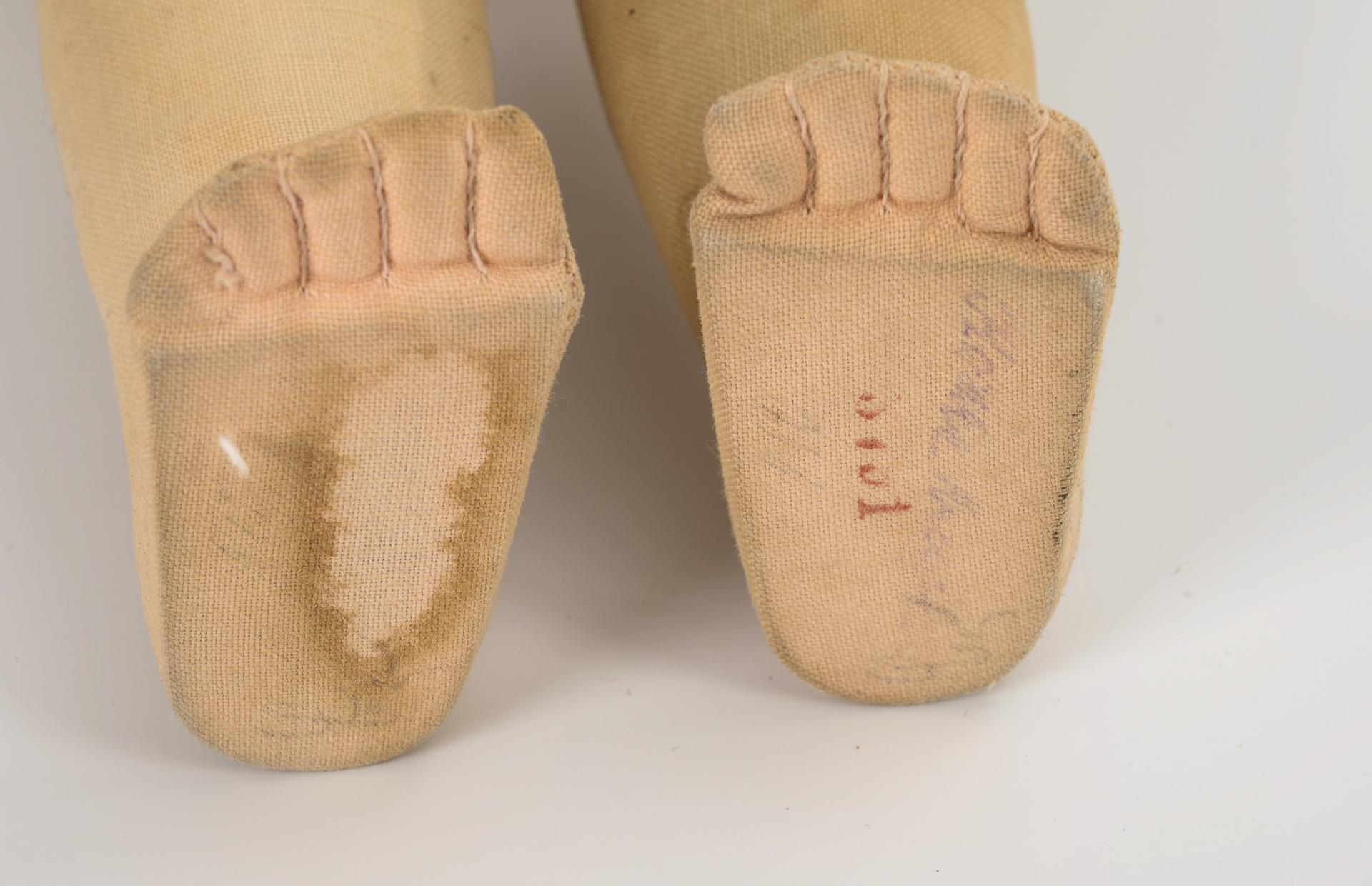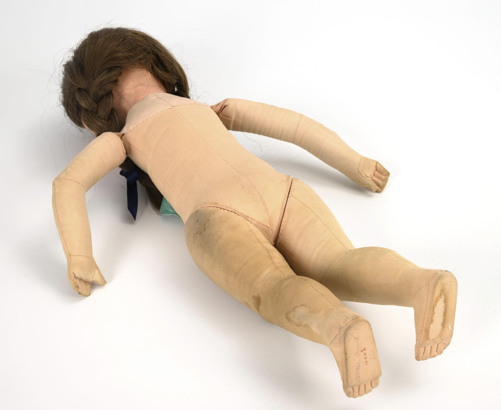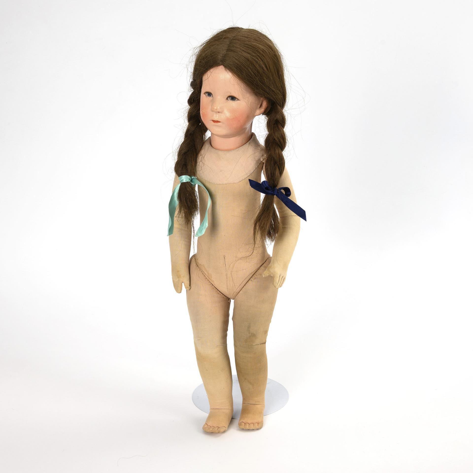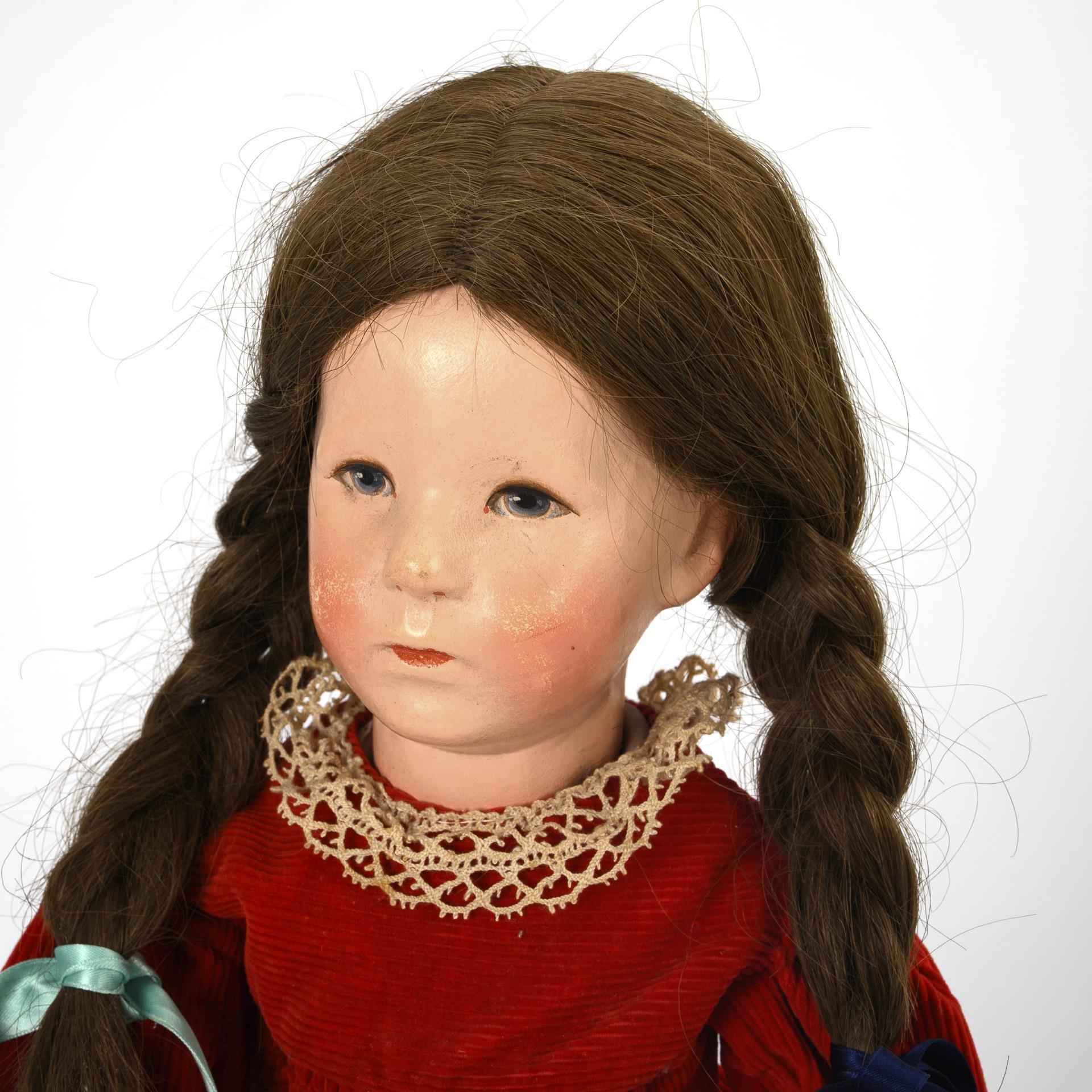 Type VIII. Fabric crank head, painted blue eyes, brown human hair wig with braided plaits. Fabric body with dangling arms, legs with disk joints. Red dress, cream-colored oilcloth shoes. With 6 items of clothing and 3 caps. The cheeks rubbed, the body stained.