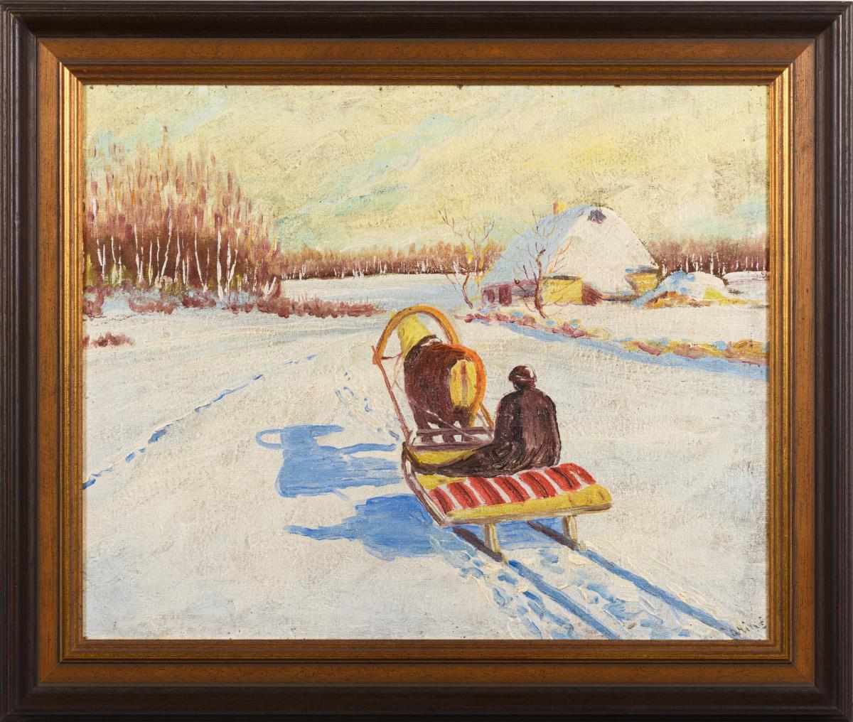Russischer Maler: Schlittenfahrer in verschneiter Landschaft