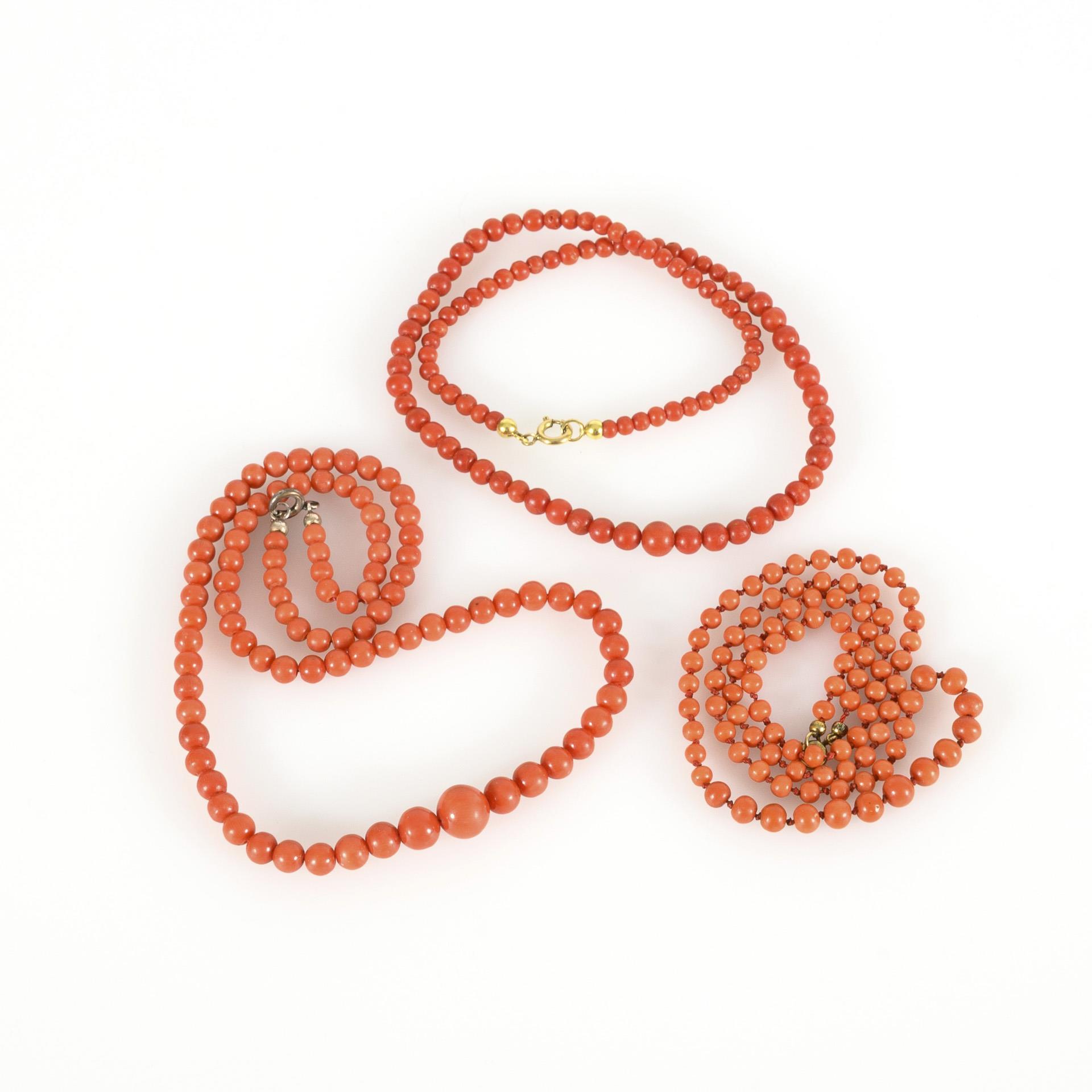 Three coral chains of different lengths, colors and sizes in a gradient. One chain individually knotted, the clasps base and partly gold-plated. String of one chain in need of renewal, but presently holding securely.