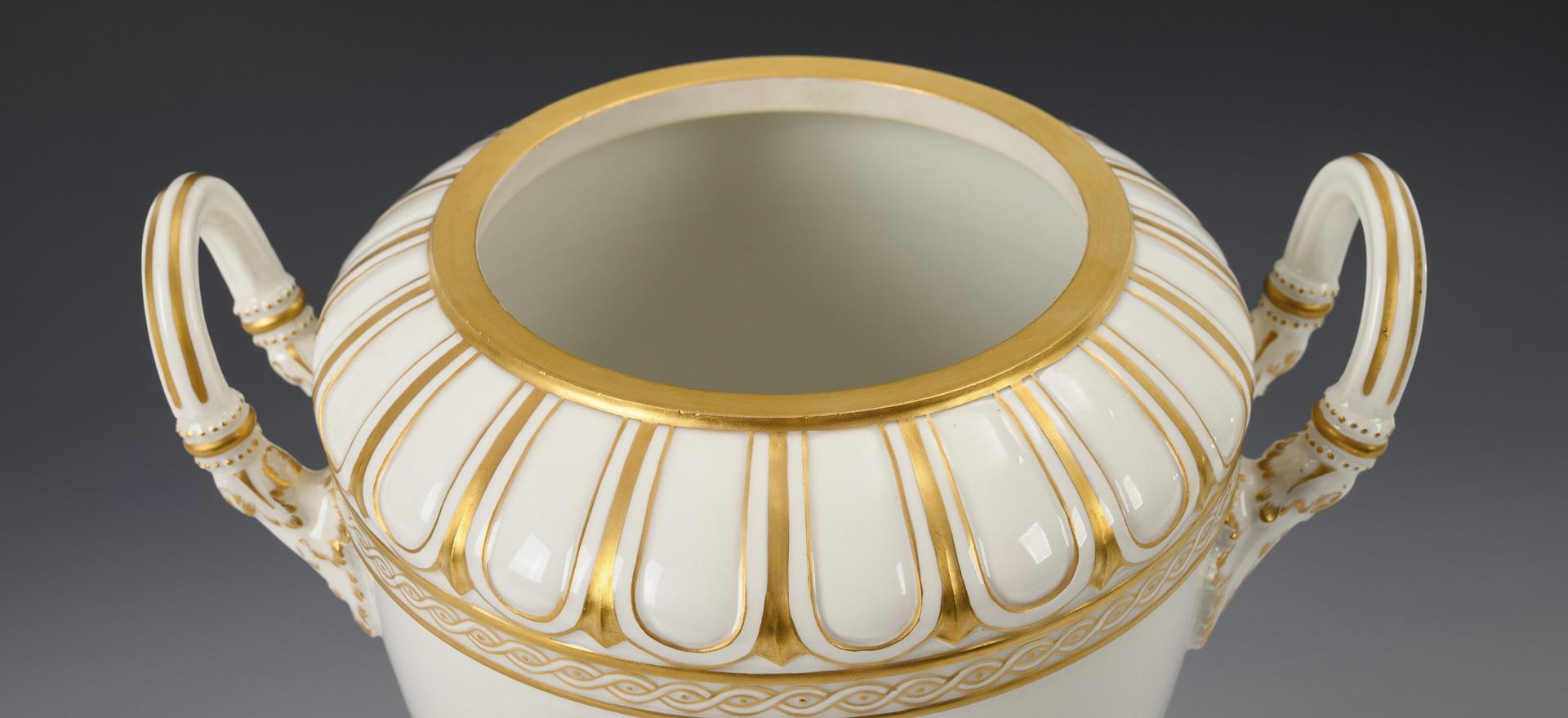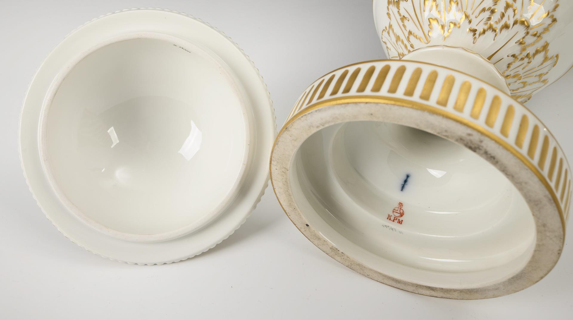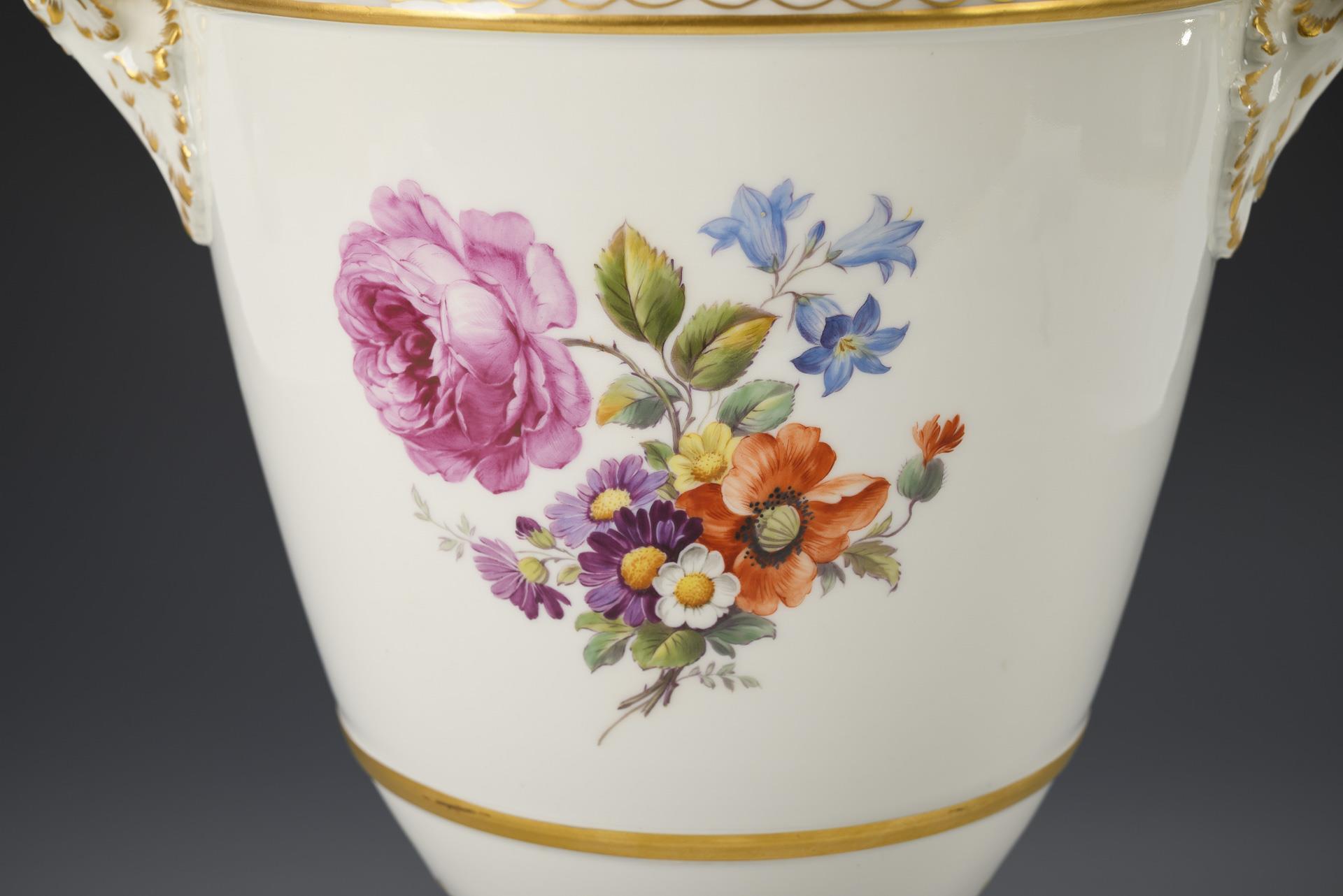 So-called Weimar vase. Ovoid body with tongue band relief, two acanthus leaf handles, pommel lid, fluted round foot, on a round plinth. On the front a bouquet of flowers with digitalis, rose and narcissus.