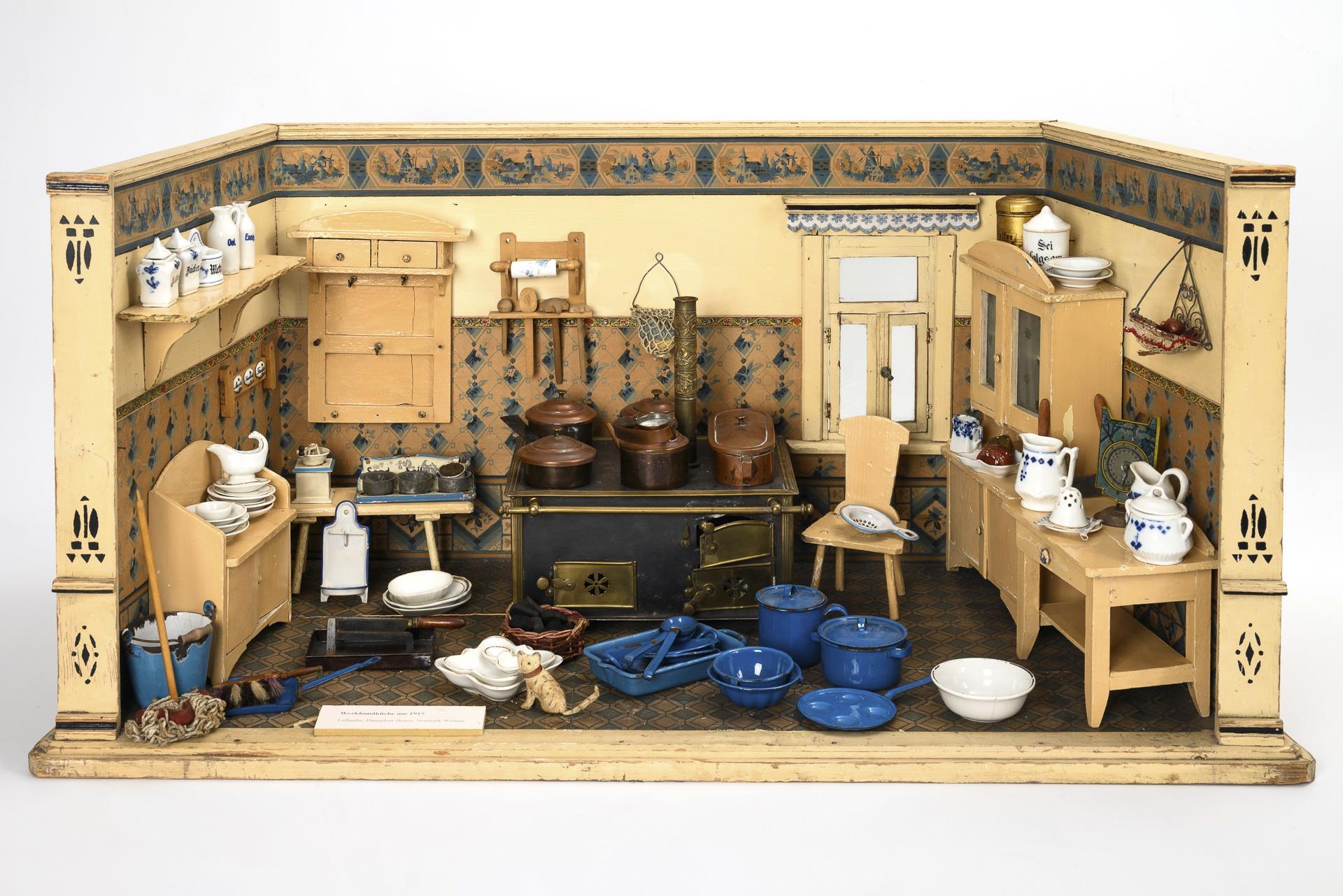 Trapezoidal 1-room cabinet with glazed window and stencilled pilaster strips. Furnished with cream-colored furniture and black tin stove with copper pots. With numerous accessories made of porcelain and enameled sheet metal. Worn, with signs of age and dry cracks.