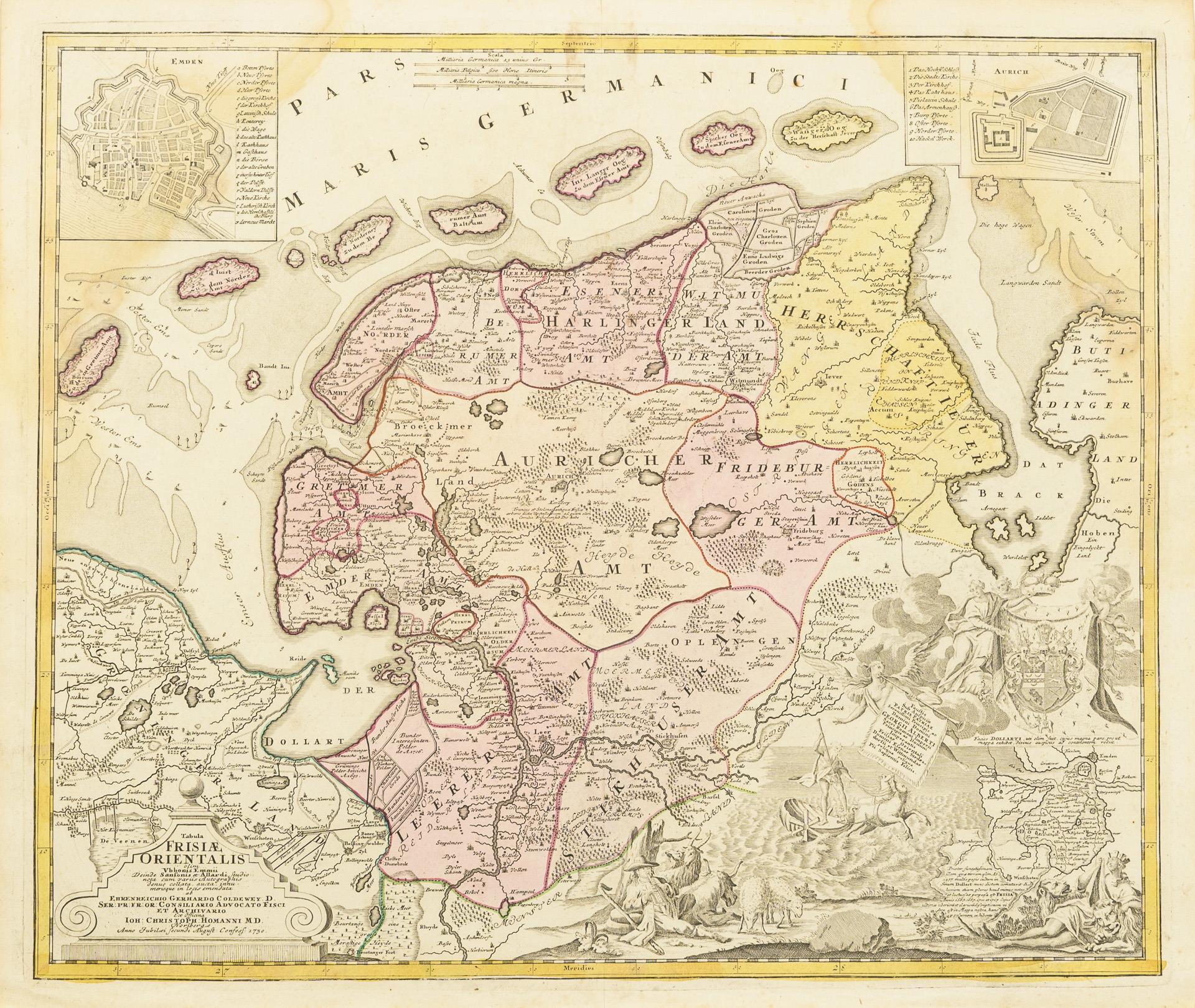 The map was engraved at the instigation of Ehrenreich Gerhard Coldewey (1702 -1773 Aurich), jurist, poet and connoisseur of the history and constitution as well as the maps and coins of East Frisia.