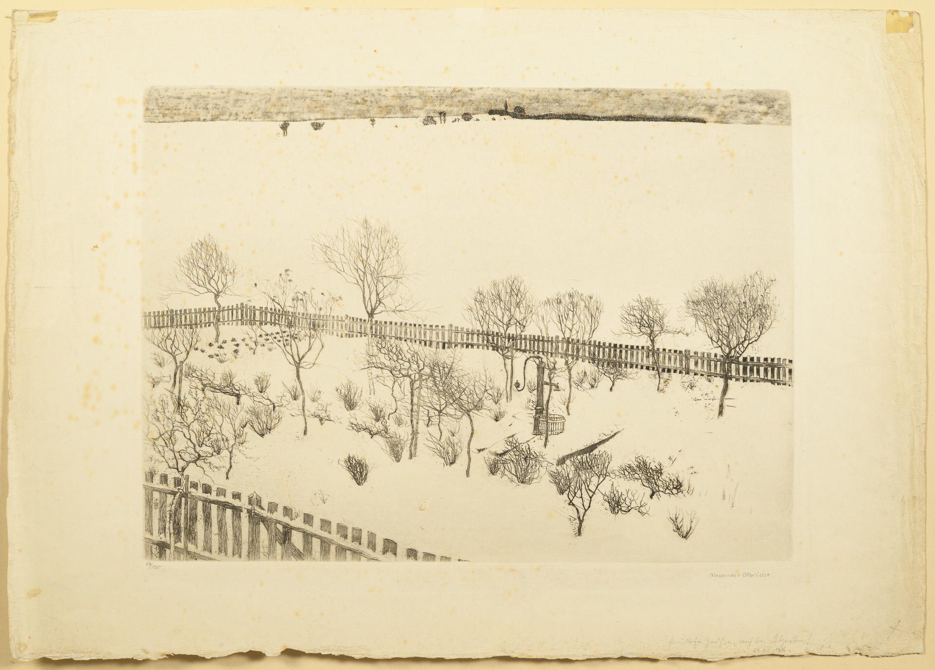 Portfolio in single sheets, 3 small and one large graphic. Portfolio "Sechs Pflanzenzeichnungen - Lithographien nach Originalen", Reiher Verlag Weimar, 1922, binding dissolved, but probably complete, 36 x 25 cm. / Large sheet with snowy landscape, fenced garden, etching, pencil signature lower right, numbered 47/150, some foxing, image 30 x 41 cm. / 3 landscape miniatures, etchings,