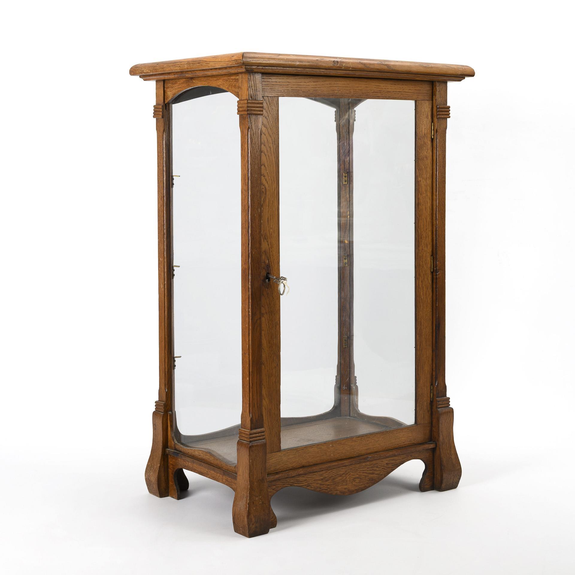 1-door, 4-sided glazed body with protruding top and curved frame with 4 curved block feet. Signs of age and wear, keyhole fitting missing, without shelves.