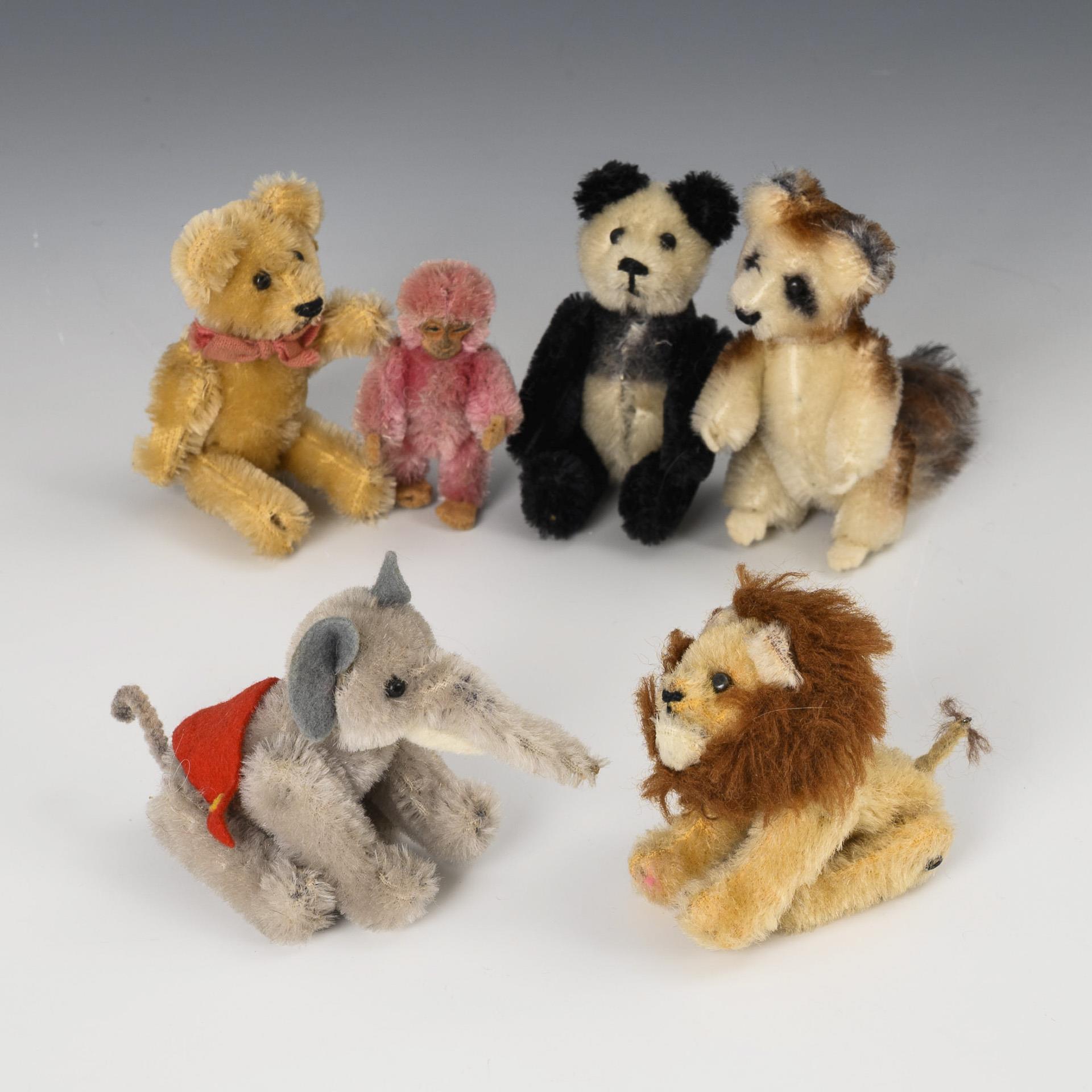 Teddy, raccoon, panda, lion, elephant post-war and pink pre-war monkey, partly Noah's Ark, L 6 - 11 cm. Slight signs of age.