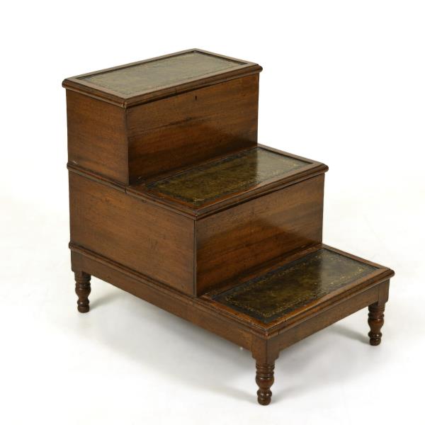 3-tiered body on 4 turned legs. Top step with lockable compartment and hinged lid, middle step as pull-out secret compartment with hinged lid. Step covering with dark green, floral embossed leather. Slight signs of age and wear, partial defects.