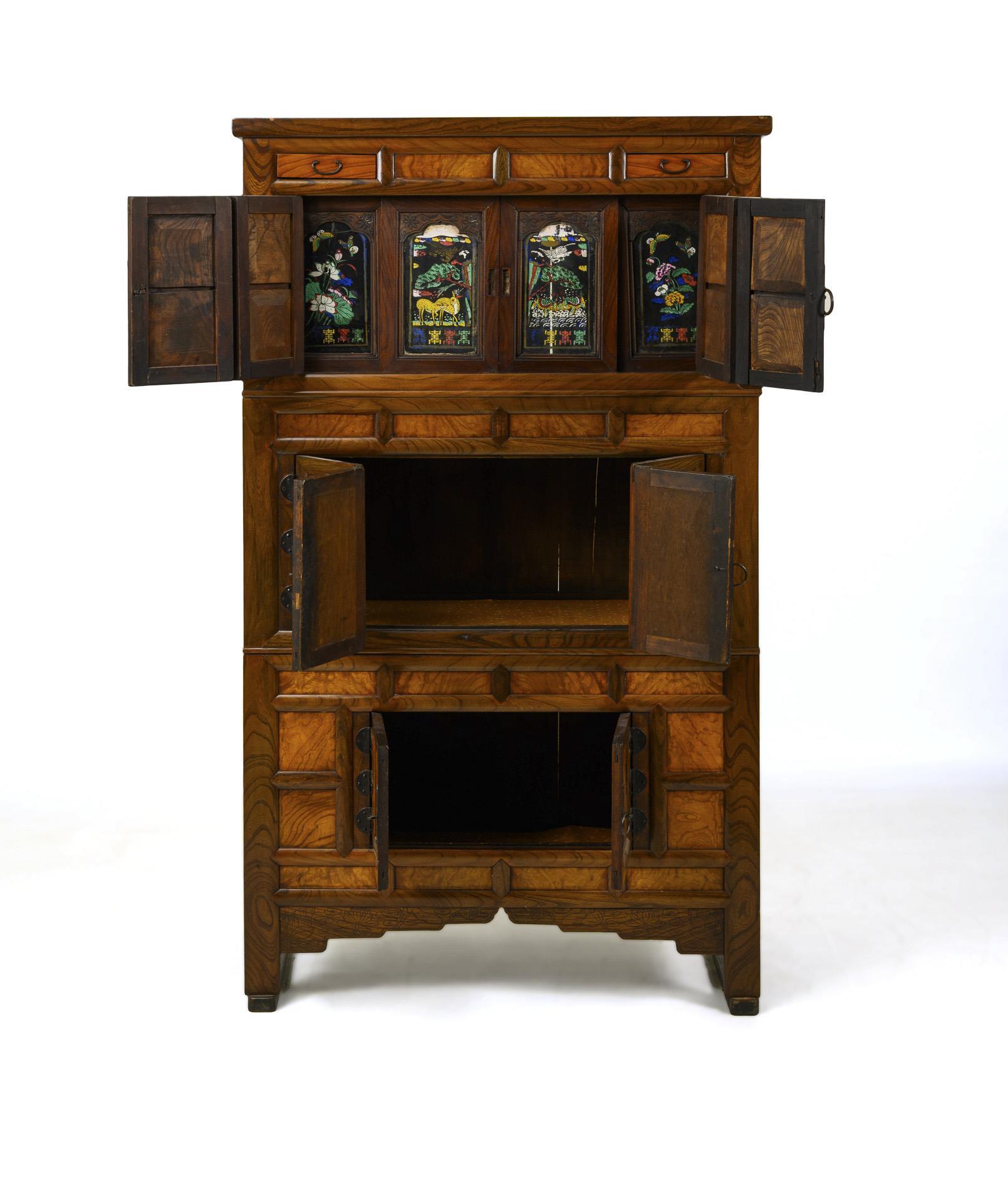 Three rectangular bodies placed on top of each other. Upper part with 2 drawers, 2 two-part door leaves and behind them four sliding frames with painted glass panes. there also characters as lucky symbols (one pane cracked several times). . Middle section also with 2 two-part hinged doors. The lower section with two simple doors and frame with engraved lotus flower decoration. Metal rings on the doors serve as handles and latches. Dry cracks in the back wall and top, partly covered with adhesive tape. Signs of use.