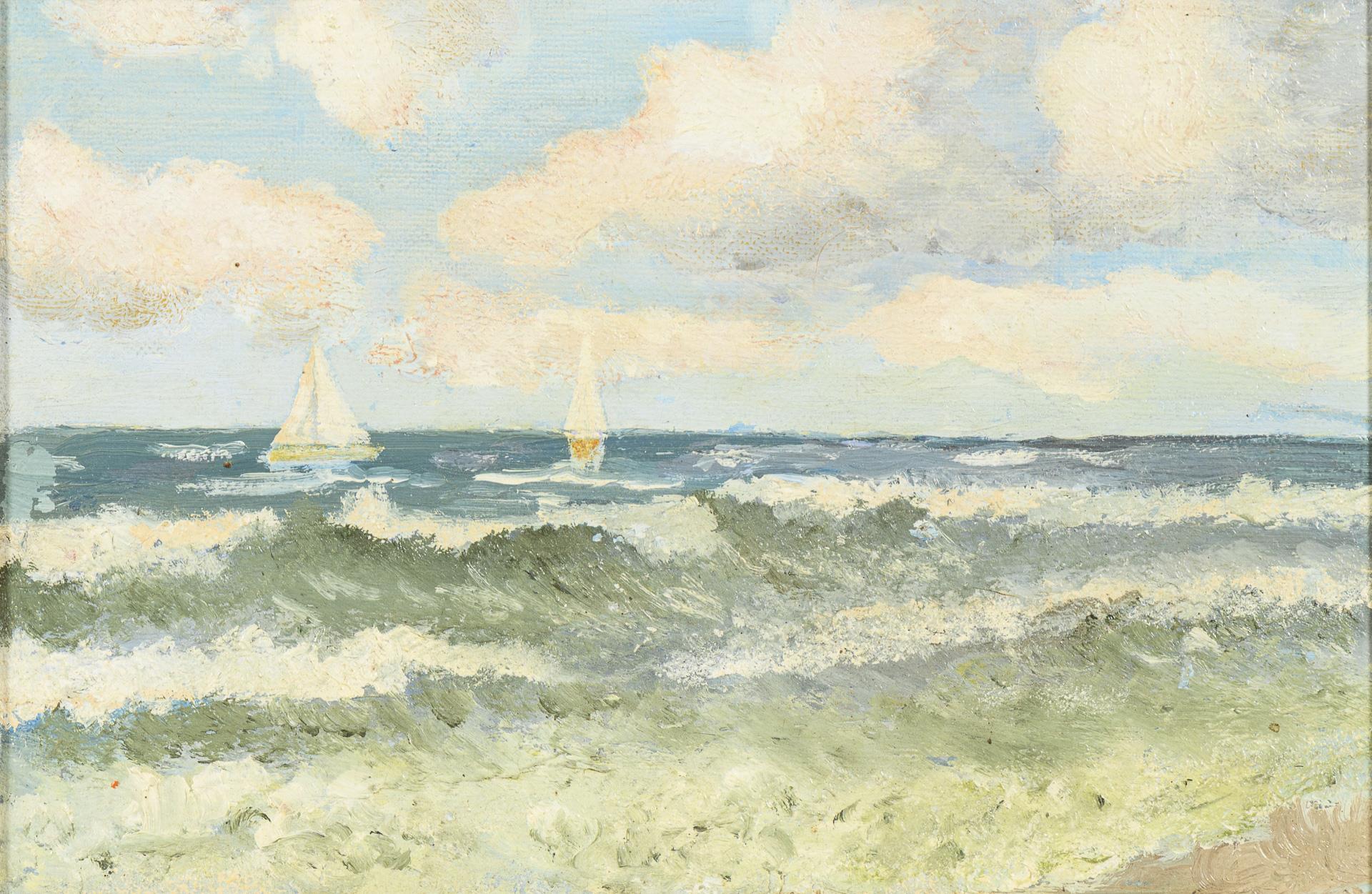 View over the high surf of the sea to the two sailors under a slightly cloudy sky.