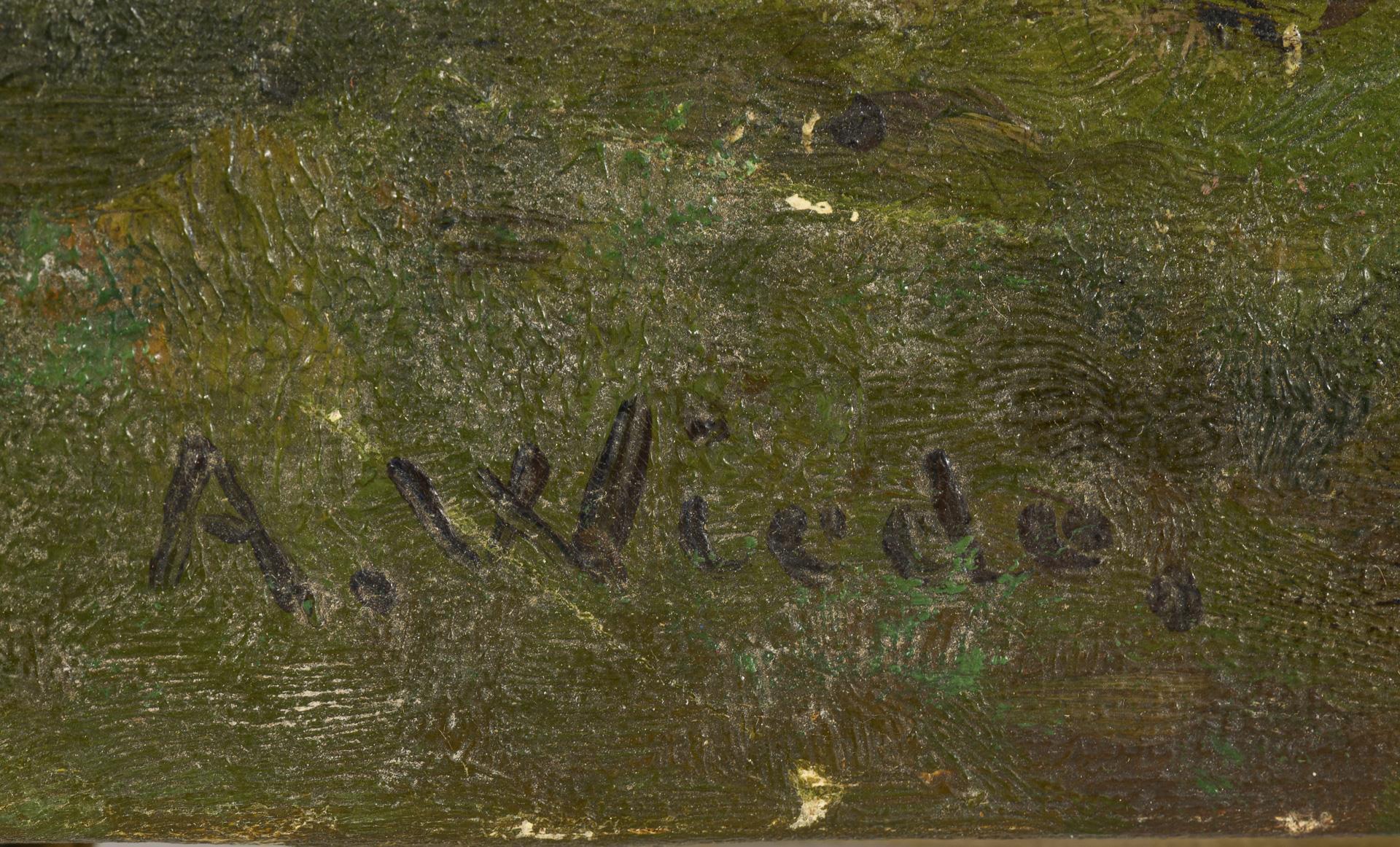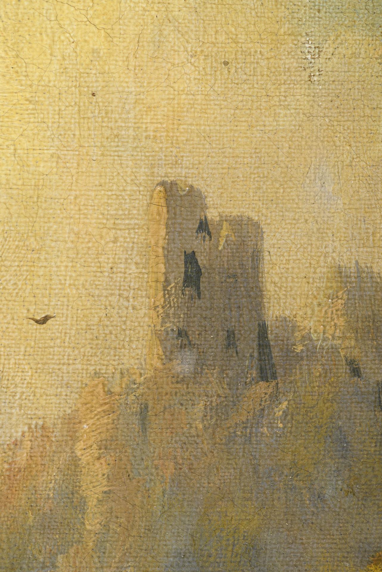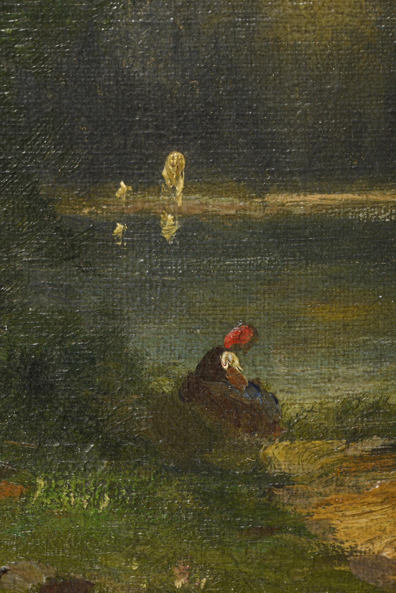 Washerwoman at the lake in the sunshine with a view of the ruins under a slightly cloudy sky. Minimal traces of age.