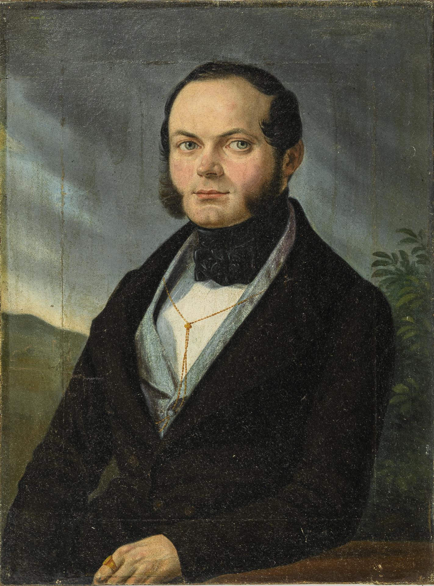 High-quality portrait of a young man with whiskers in front of a cloudy sky above a mountainous landscape. Ageing.