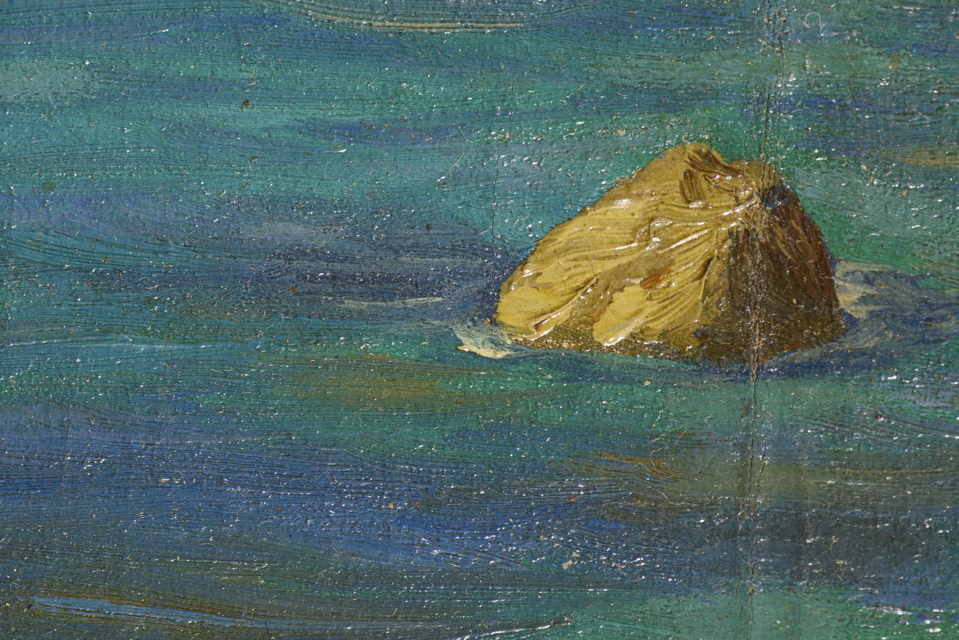Warm sunlight over the rocky coast with the light blue water. One restored area in the margin.