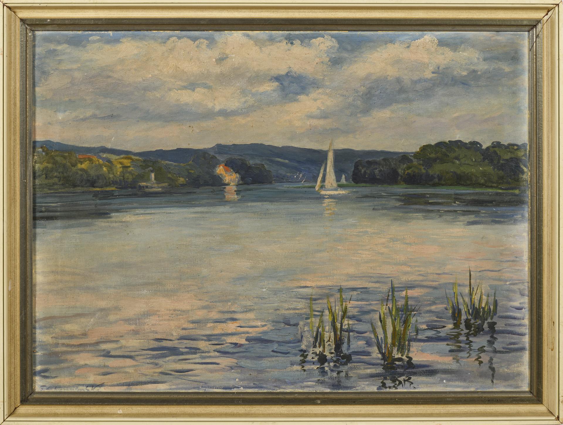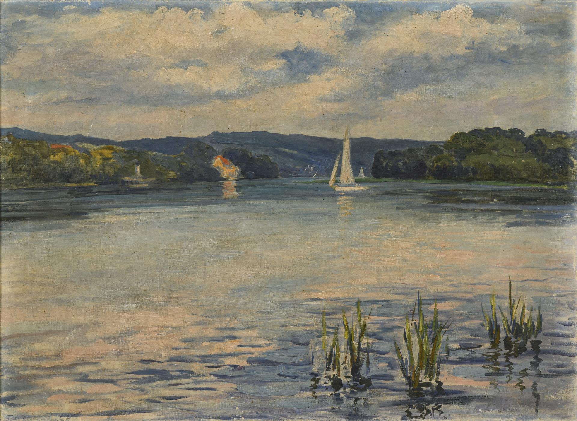 Sailing boat on calm water under a slightly cloudy sky. Slight traces of age.