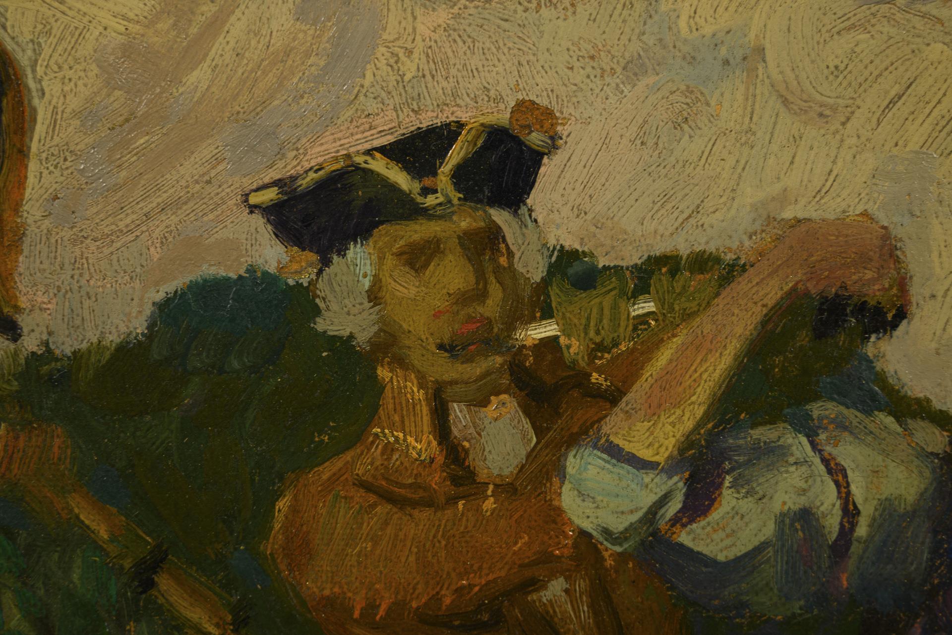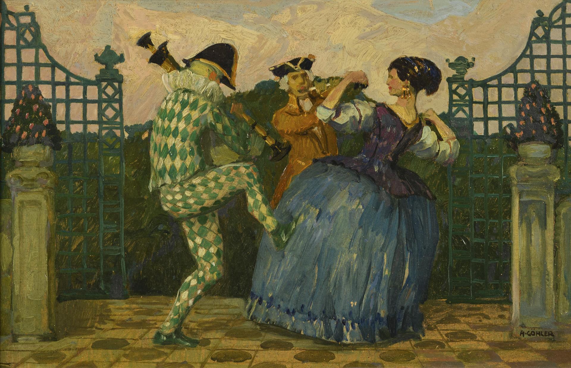 Harlequin playing music next to a dancing couple in rococo dress. Slight traces of age.
