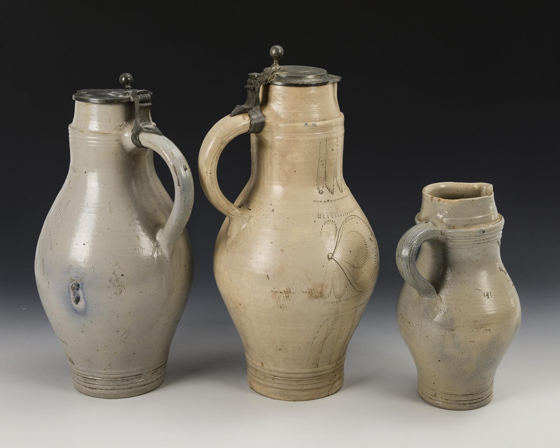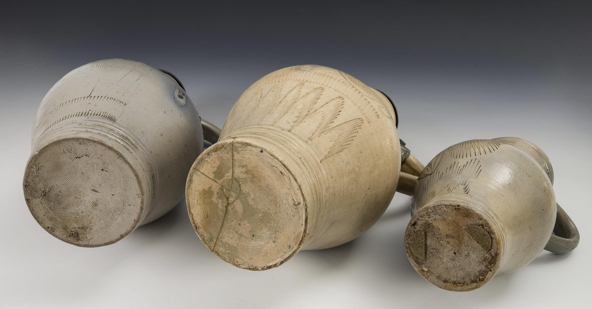 3 Westerwald stoneware jugs with various incised decorations.