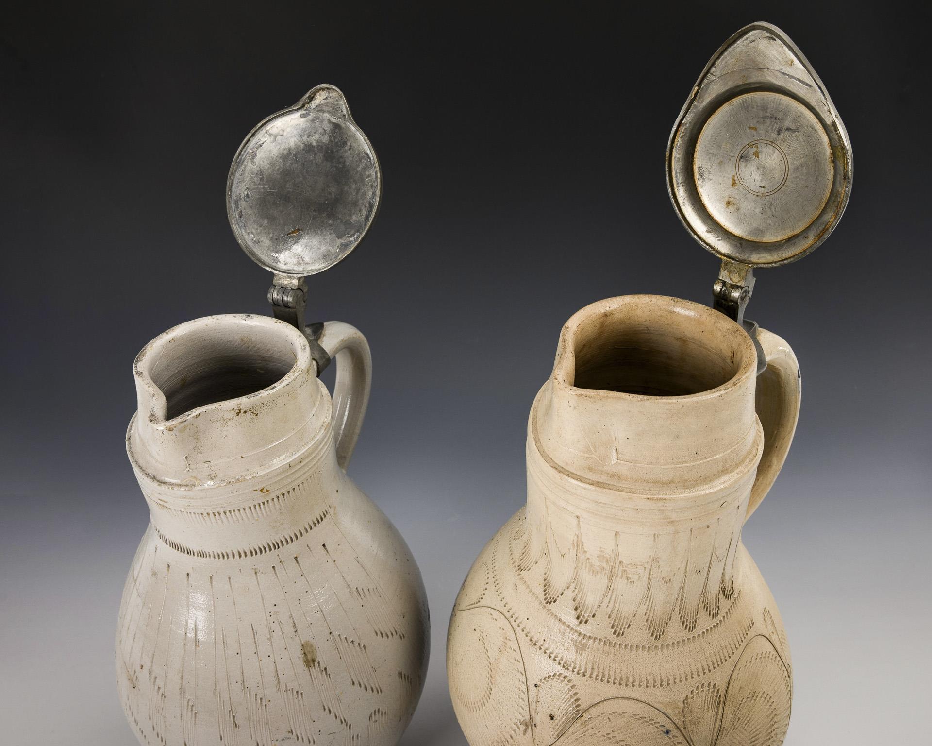 Each with an ovoid body with offset cylindrical neck and tapering strap handle. Decorated on the front with decorative, partly floral scratch patterns. Two flat pewter lids with ball pushers, one of which is profiled and engraved with a monogram. Slight signs of age and wear, slightly bumped in places, 1 jug with a fine crack at the mouth and glued to the base.