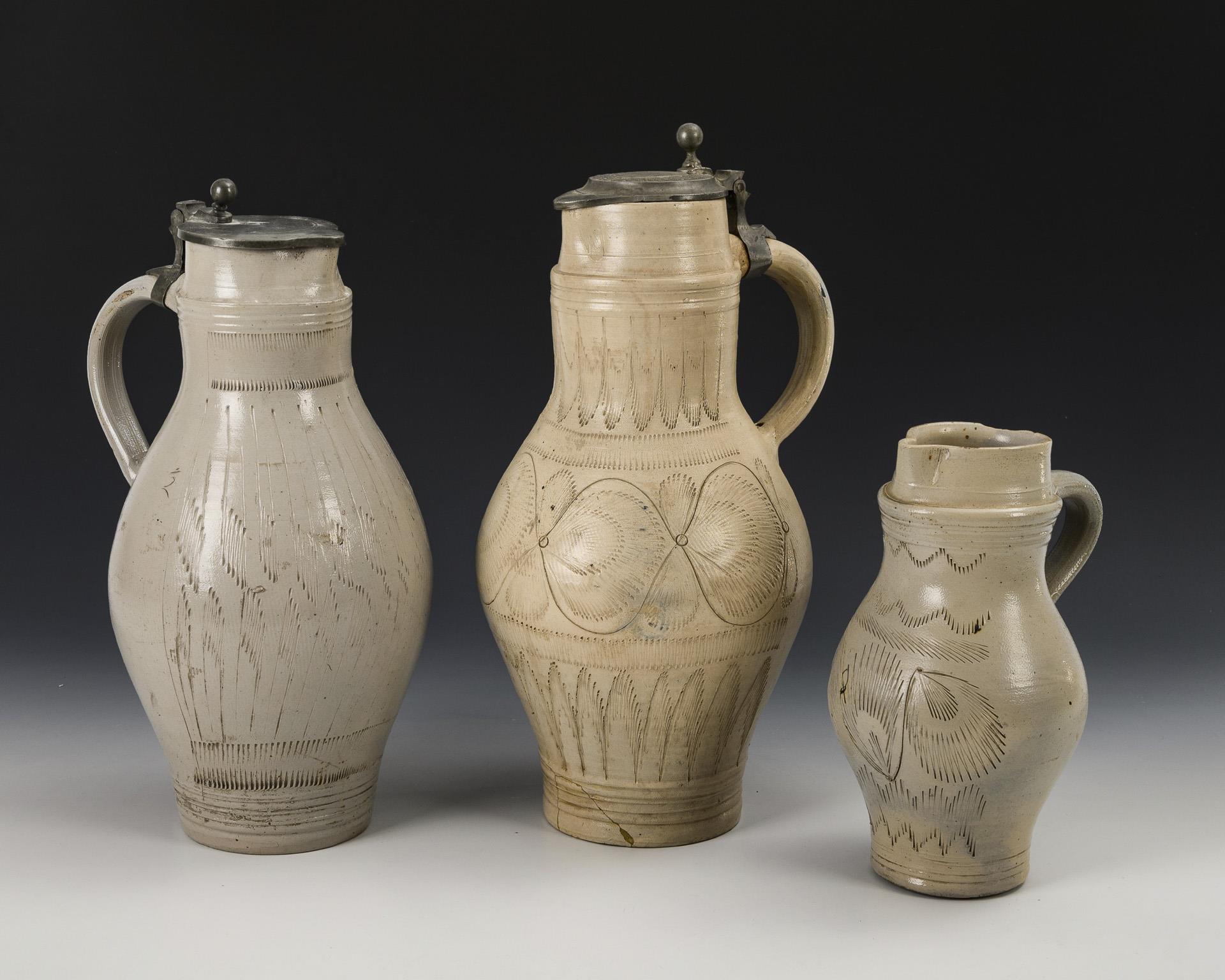You are here:   Home Categories Ceramics 3 Westerwälder Steinzeug-Kannen mit Ritzdekor, 1x am Boden geklebt