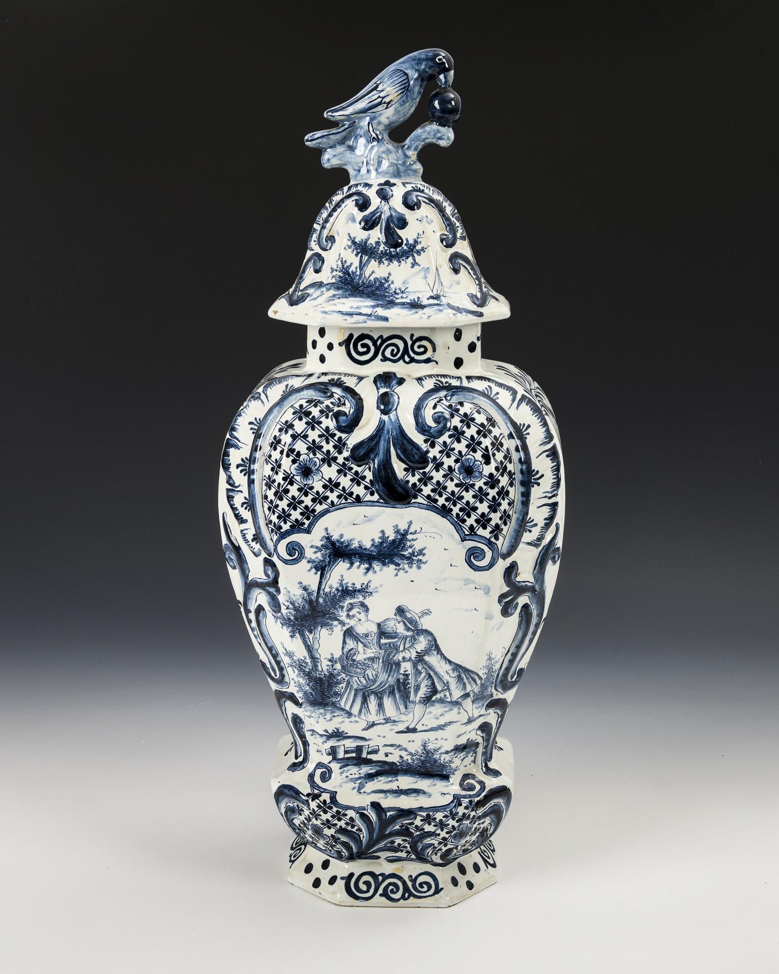 Flat, eight-cornered baluster vase with relief wall and stepped stand. Baroque-style figural scene in a landscape on the front. Bell-shaped lid with bird pommel. Impacts and glaze rubbing.