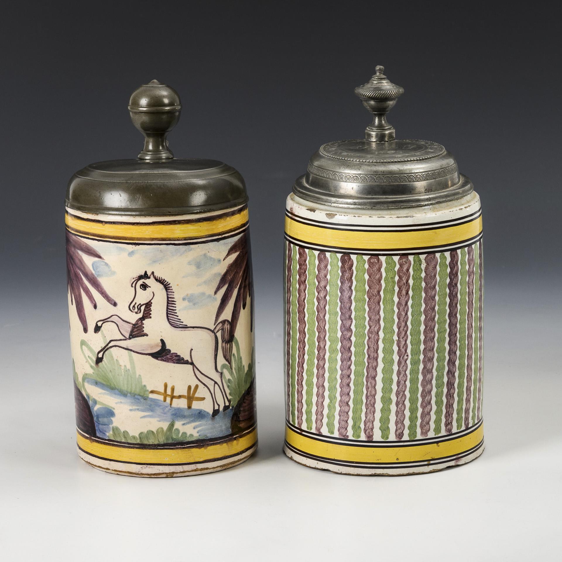 Each cylindrical body with strap handle, 1x jumping horse in a landscape, 1x vertical decoration. Each with pewter lid and push handle, 1x engraved "JMG 1802". 1 jug cracked, 1 jug restored, each with glaze chips and rubbing.