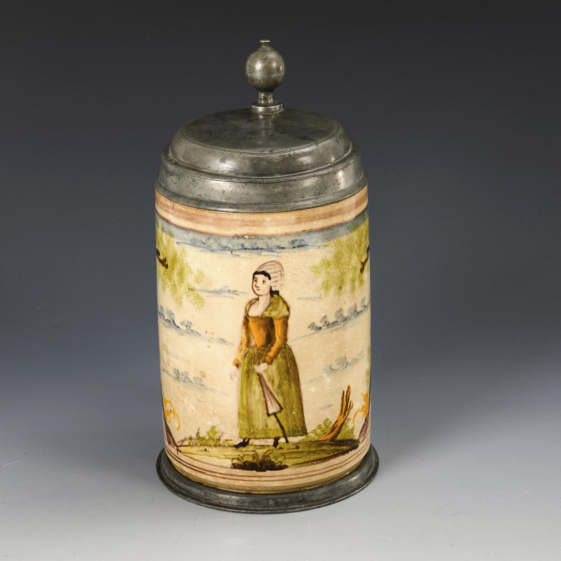 Cylindrical body with a fluted band handle and acanthus leaf ends, the front with a peasant woman in a landscape. Slightly cracked in places, with chips and glaze defects.