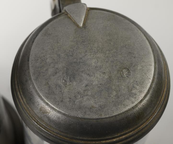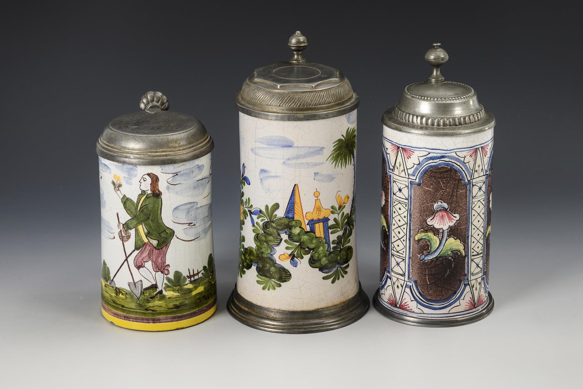Each with cylindrical body, 2x beaded handles, 1x ribbon handle. 1x pilaster decoration with floral cartouches, 1x farmer in landscape, 1x cloud-like floral decoration with architectural motifs. Each with pewter lid and pusher, some with pewter stand. 1 jug with glaze cracks, 1 jug with bumped stand.