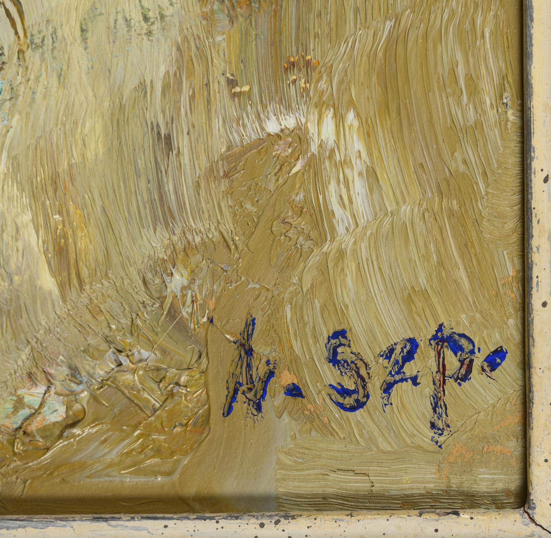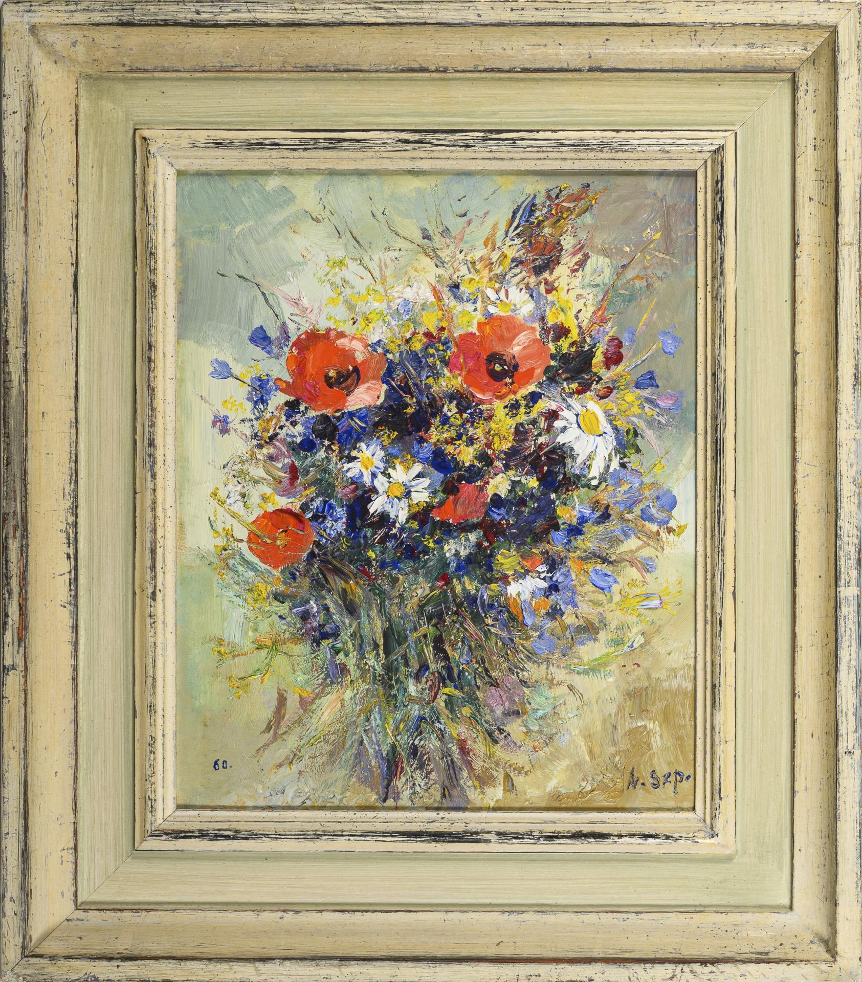 Expressive meadow bouquet painted in his usual impasto style; against a light background.