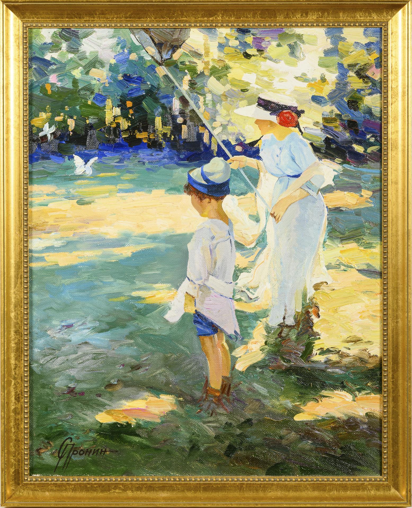 Impressionist scene with mother and child in the sunshine with the nets.
