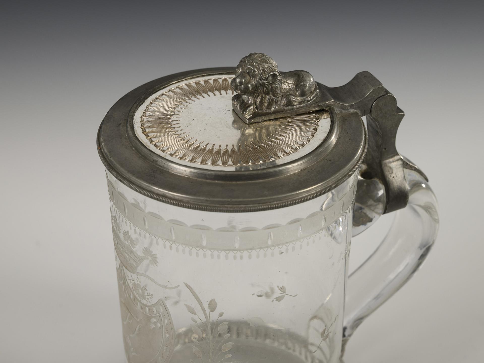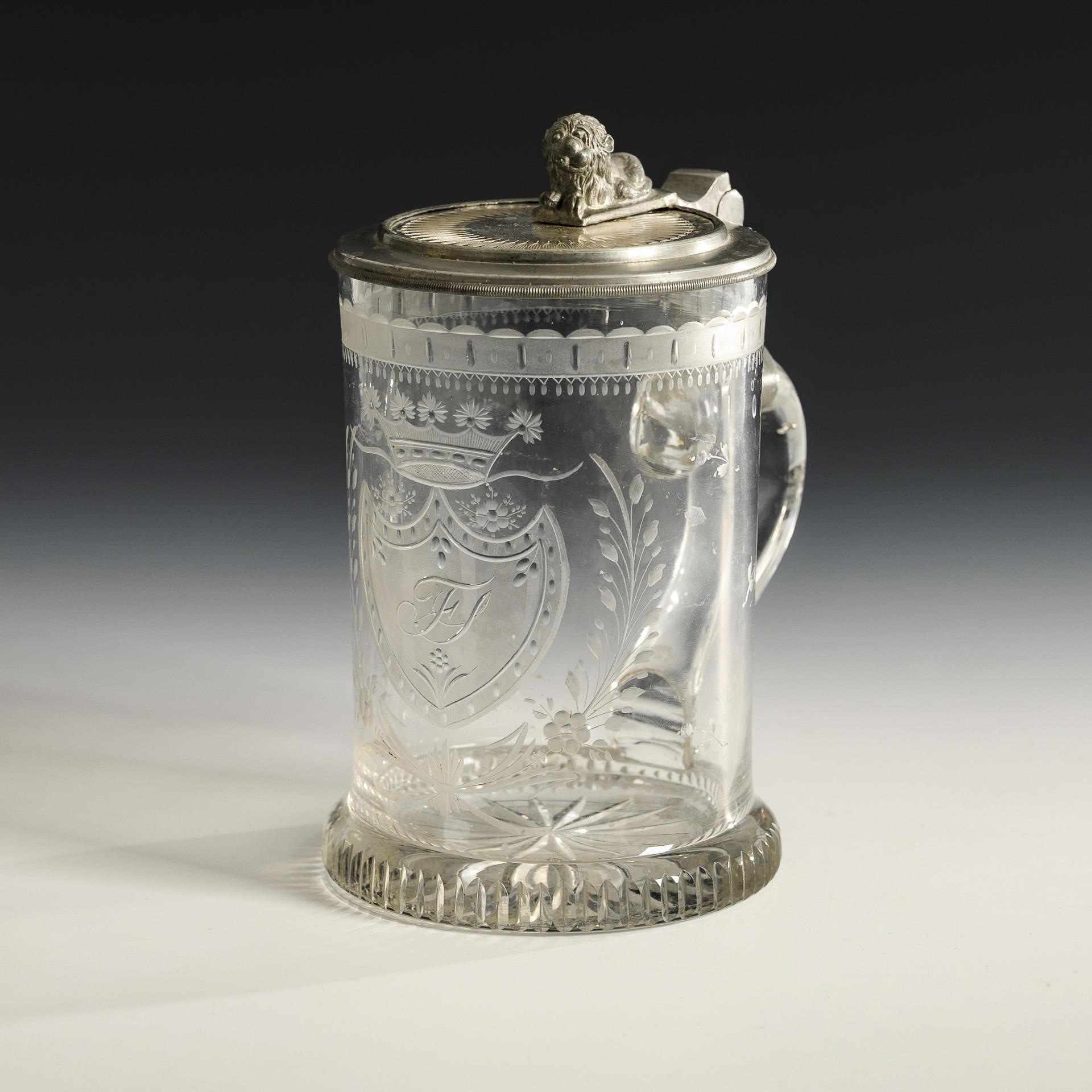Cylindrical jug with ribbon handle and later added, pewter-mounted hinged lid with lion's back; star-shaped base. On the front an engraved, partly polished coat of arms shield with the monogram "FS" and a noble crown.