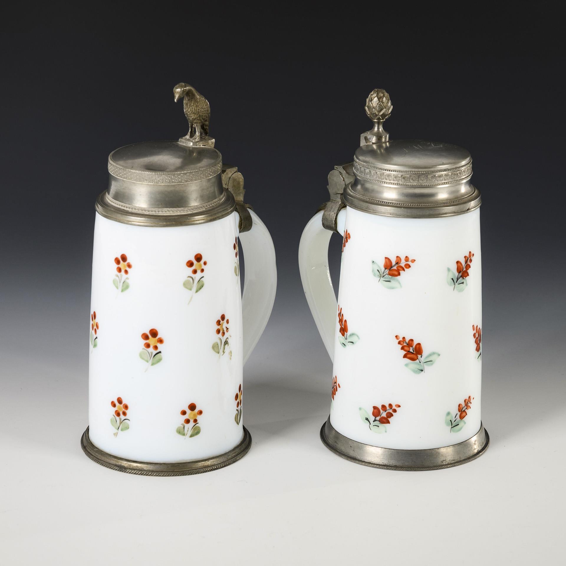 White, opalescent milk glass, polychrome enamel painting, pewter. H 19.5 and 20.5 cm. 1.2 kg.