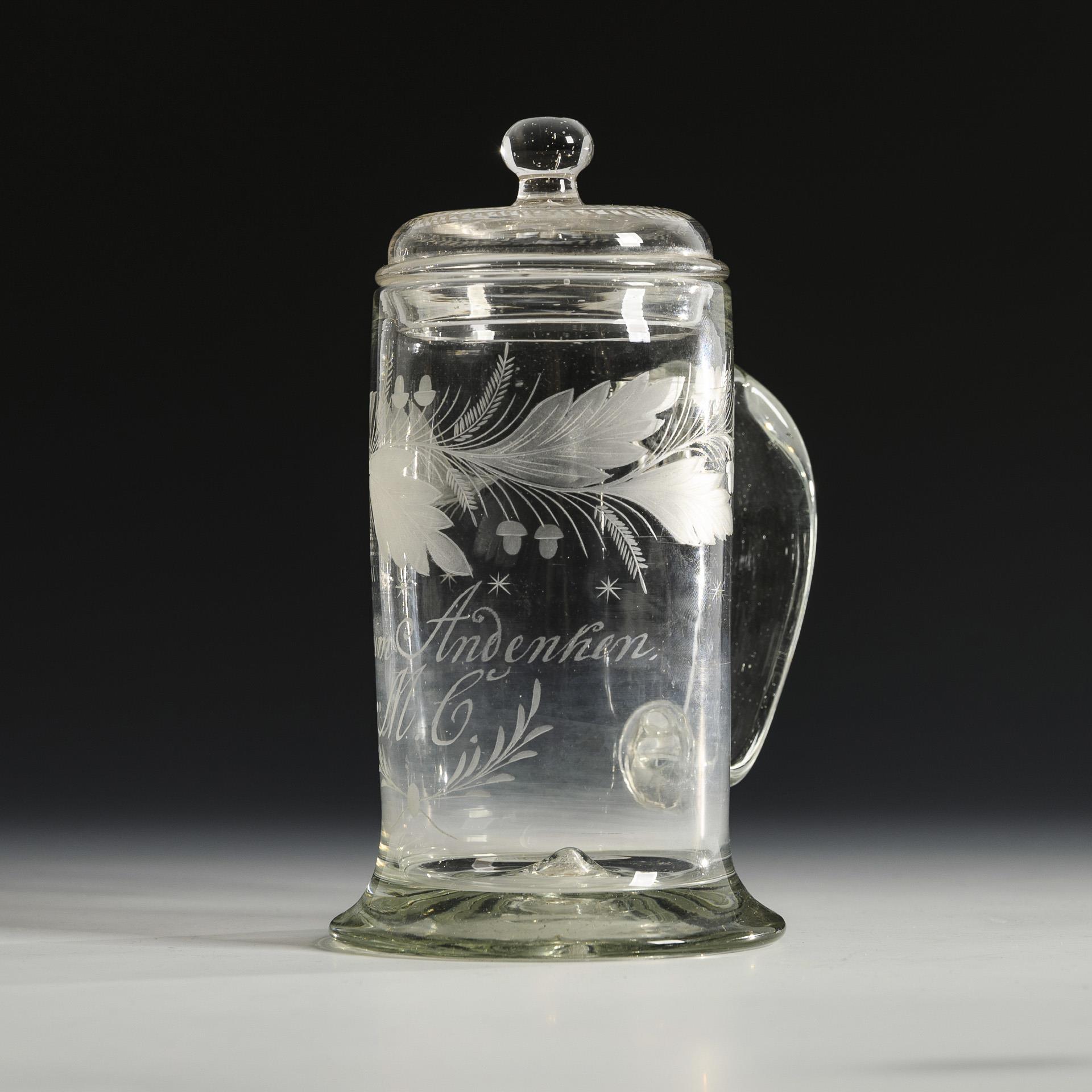 Cylindrical jug with flared stand, ribbon handle and knobbed lid. Engraved inscription "Zum Andenken M. C.".