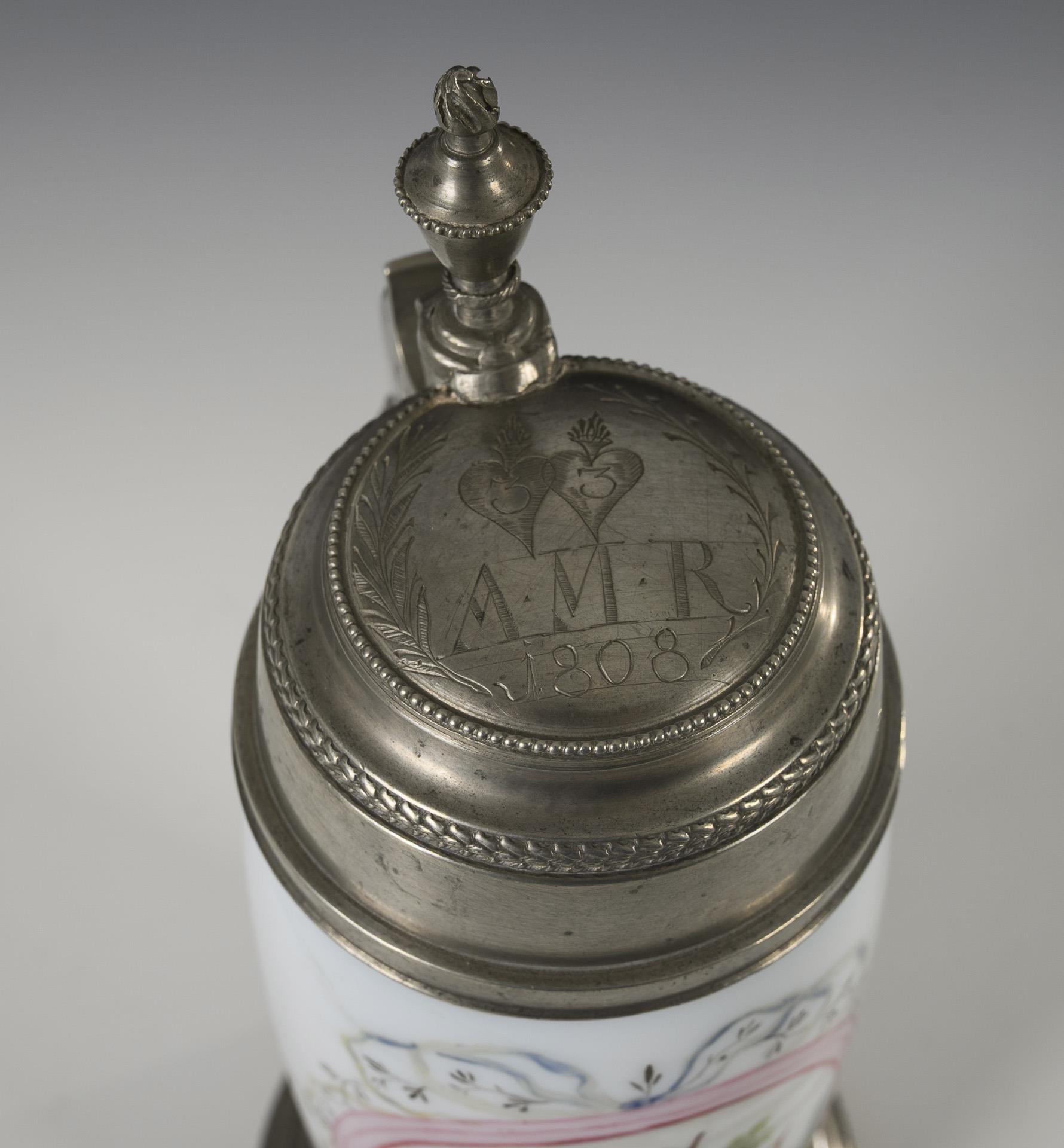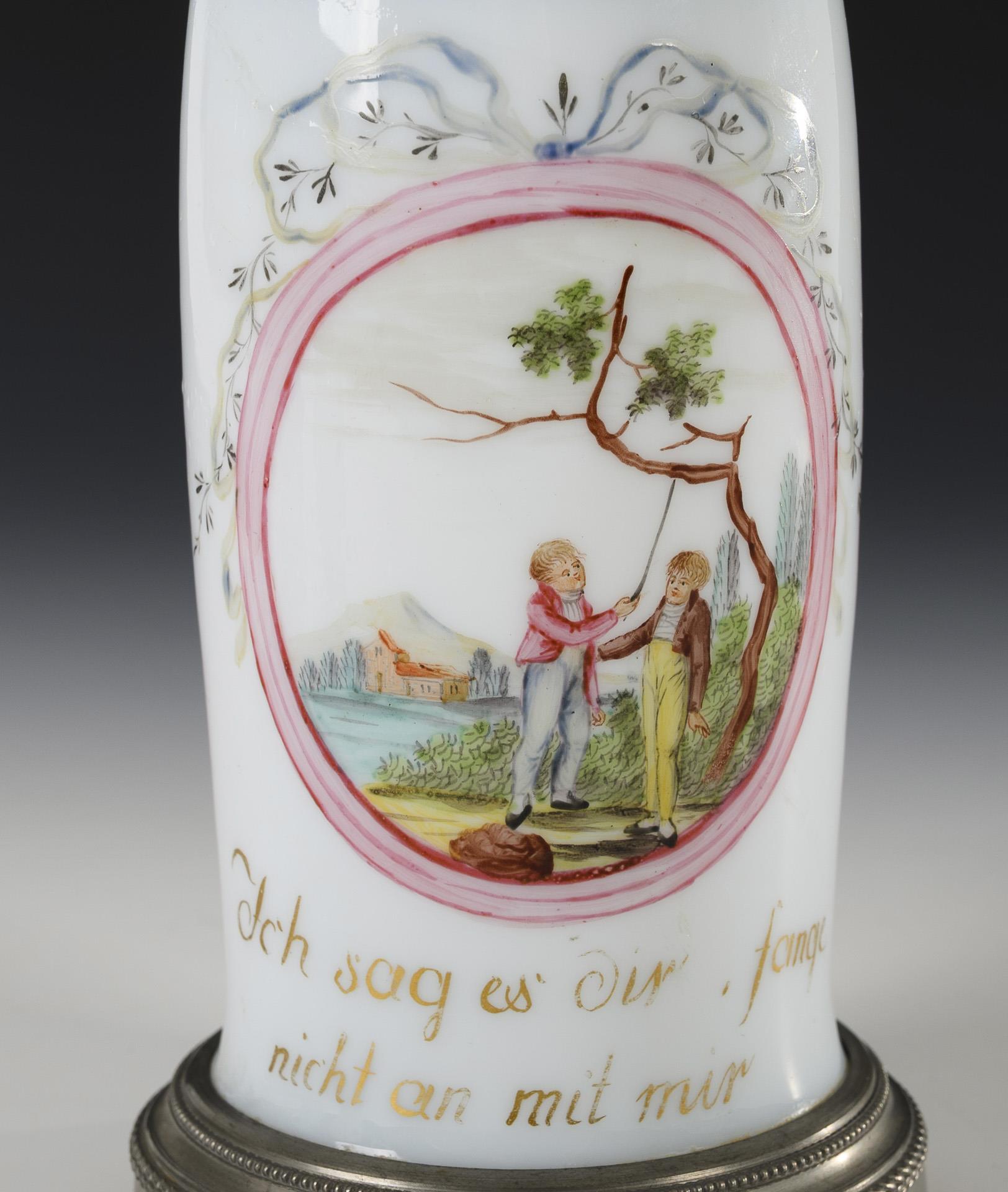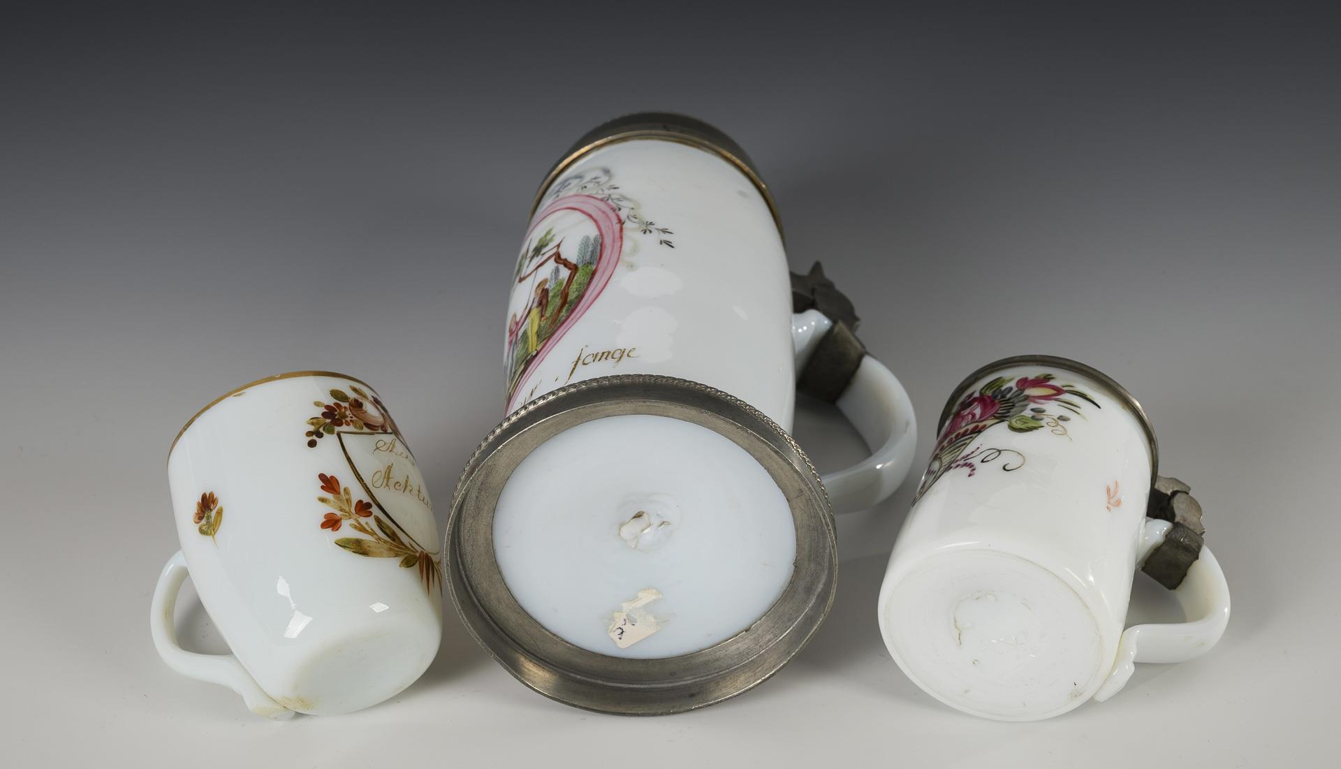 1x slim beer mug with pewter-mounted stand, ribbon handle and pewter lid: on the front a medallion with the depiction of two boys under a tree, below the inscription "Ich sag dir, fange nicht an mit mir" (H 23.5 cm). / 1x small beer mug with band handle and pewter lid and a depiction of a cornucopia with flowers on the front (h 10.5 cm). / 1x ovoid mug with a floral framed coat of arms on the front with the inscription "Aus Achtung" (H 7.5 cm). 2 stress cracks to the handle, 1x rubbed gold.