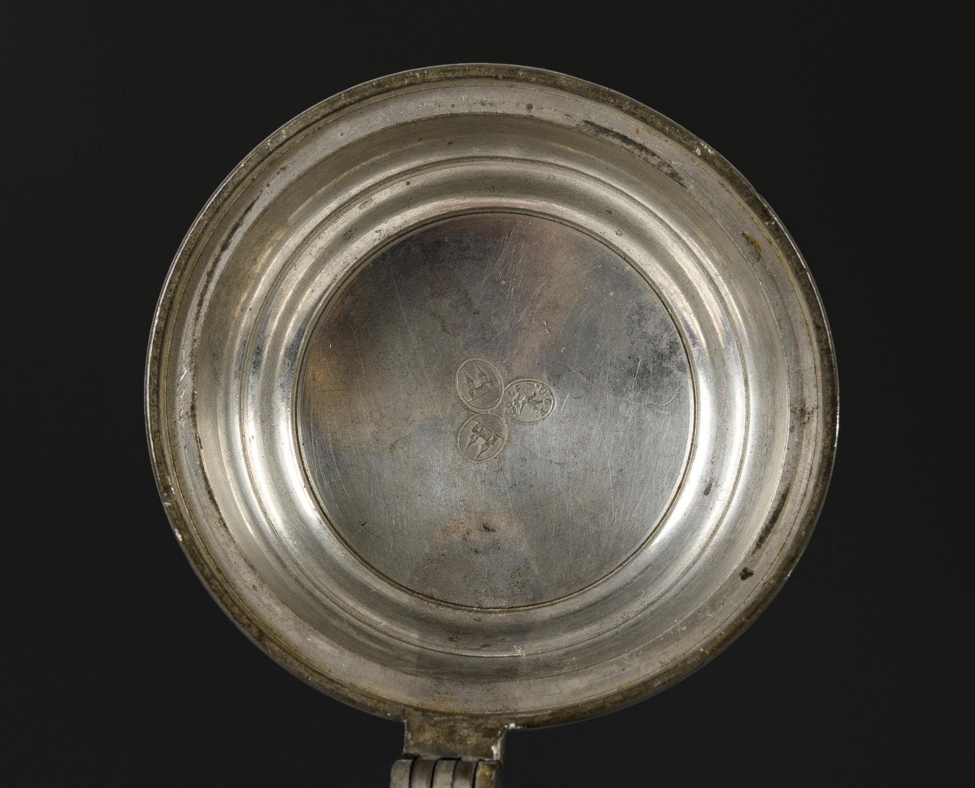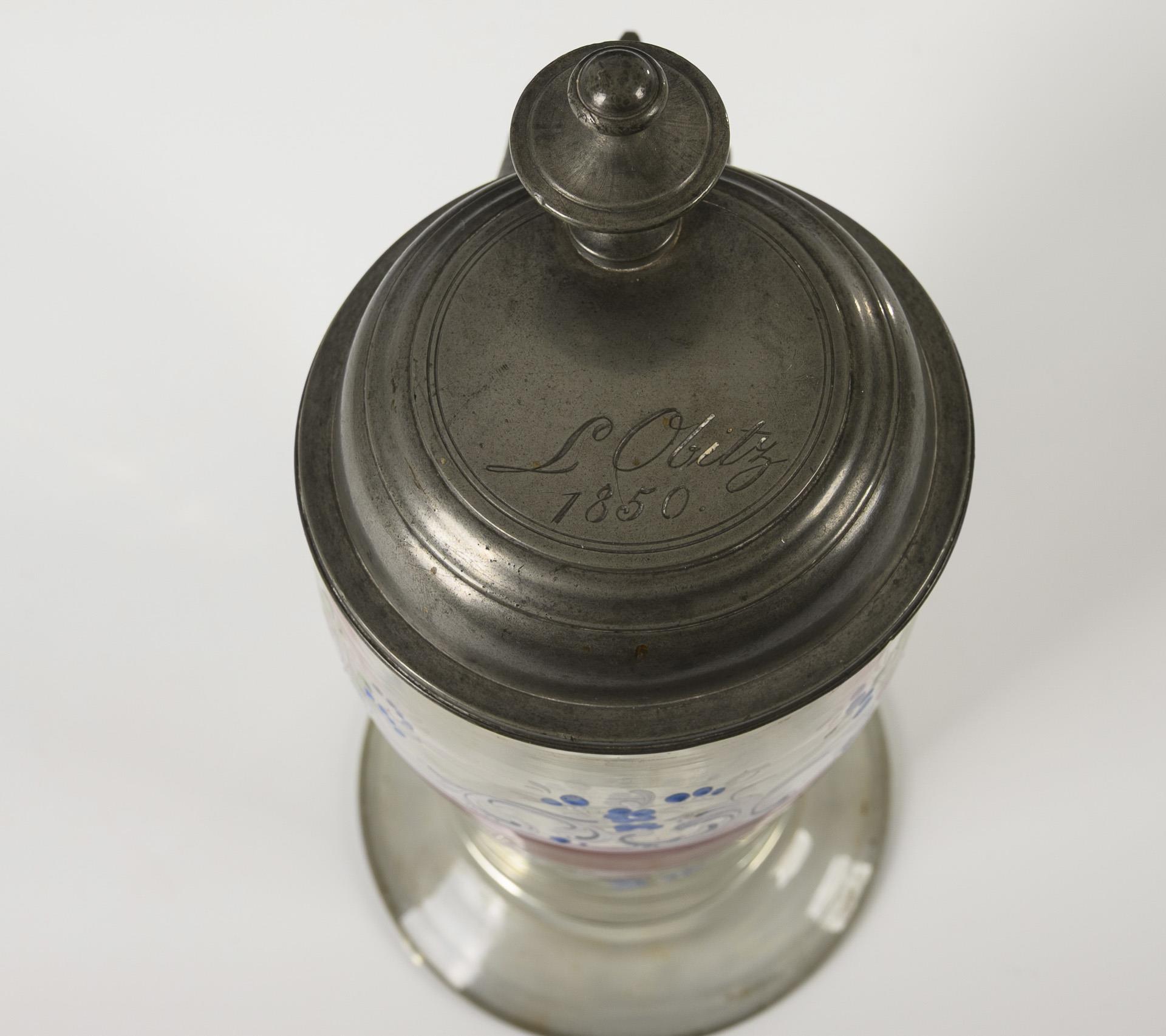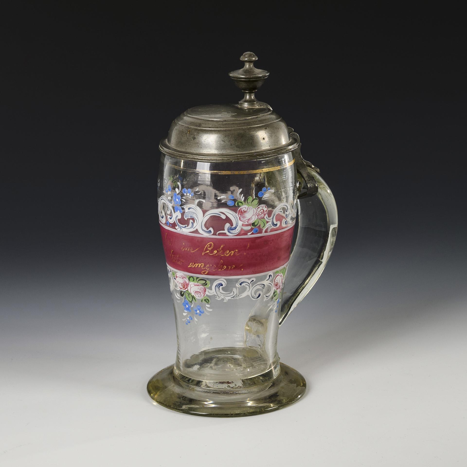 Body widening slightly towards the top, flared stand, ribbon handle and pewter-mounted hinged lid with the engraving "L. Obitz 1850.". Between rocailles and rose and forget-me-not blossoms a purple ribbon with the inscription "Zufriedenheit im Leben! Shall always surround you.". Gold rubbed, old repairs to the sprue of the lid, stress crack at the base of the handle.