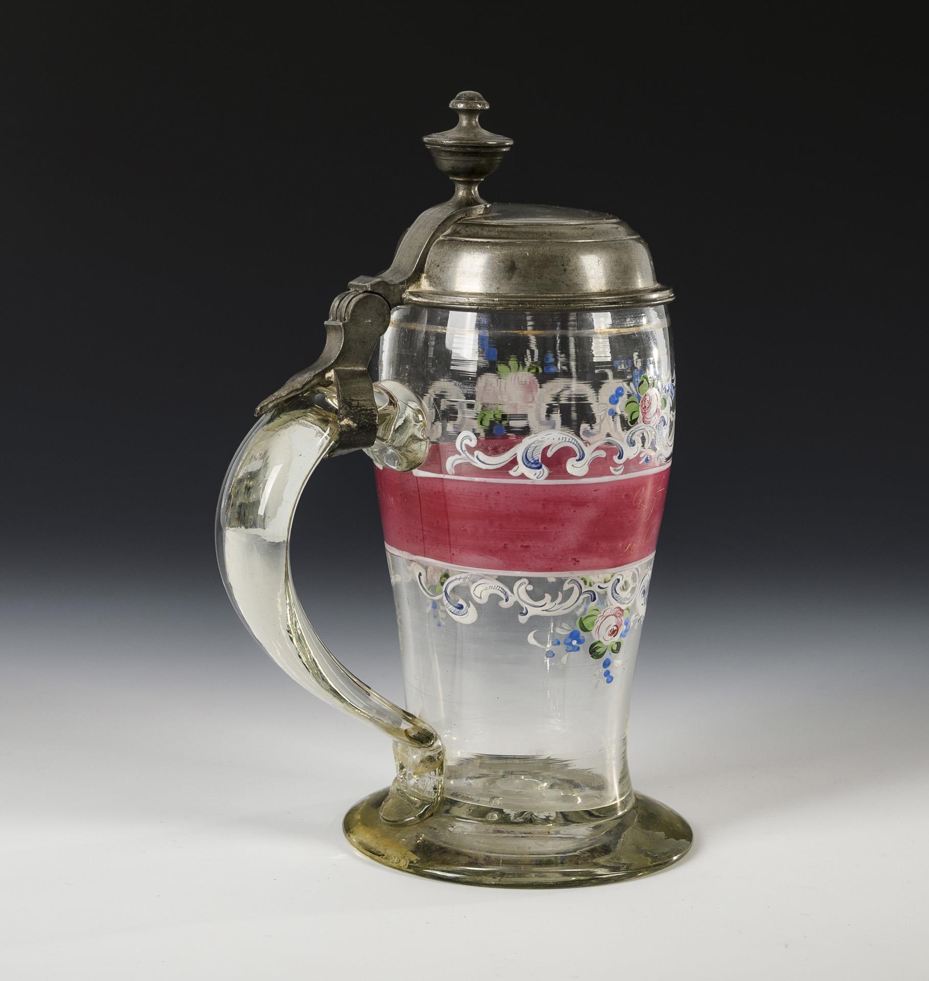 Colorless glass, polychrome enamel painting, gold decoration, pewter. H 24 cm. Approx. 1.1 kg.