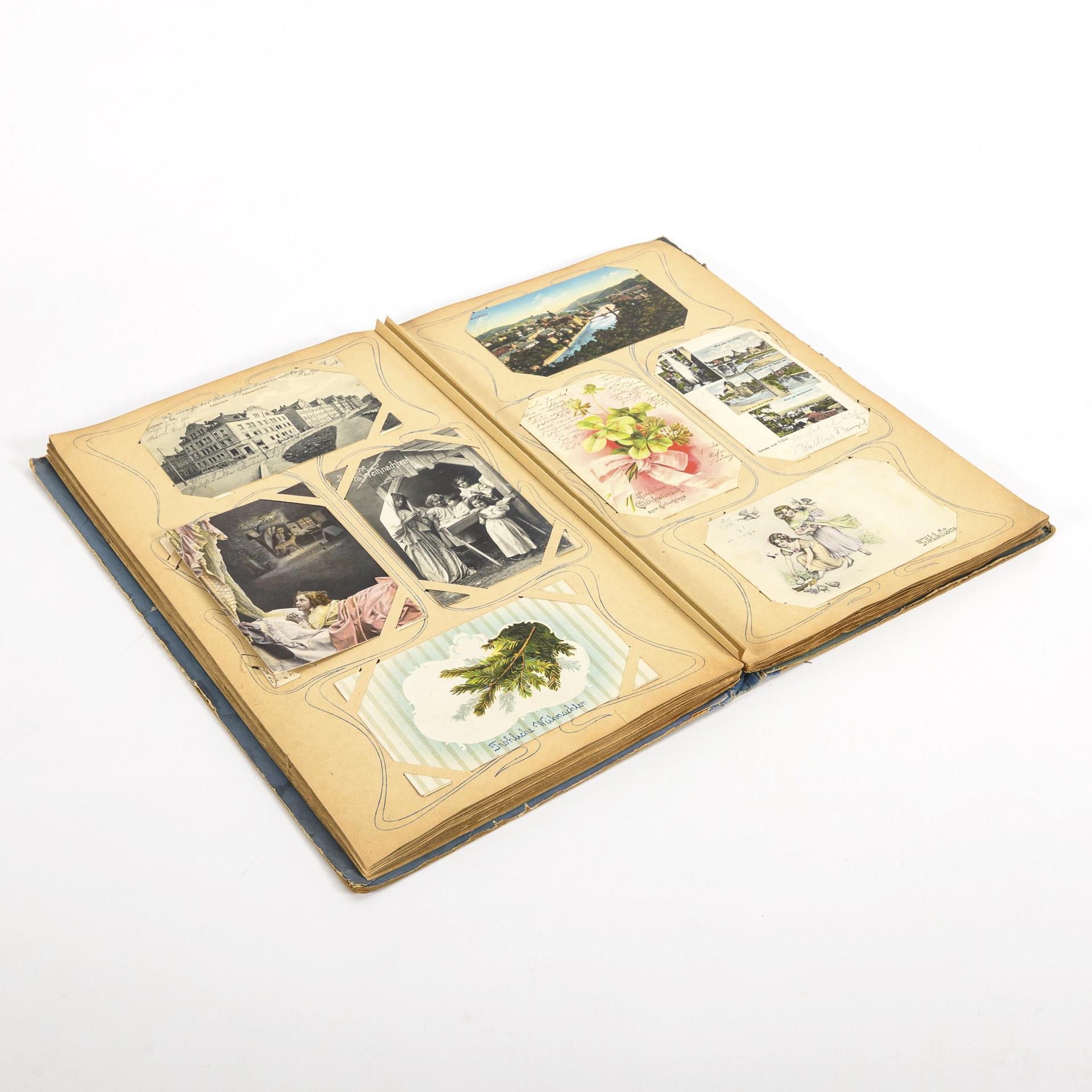 With picture postcards, greeting cards and rare kitsch cards, also embossed. Around 1905-1915. in a blue album with lilies and castle motif.