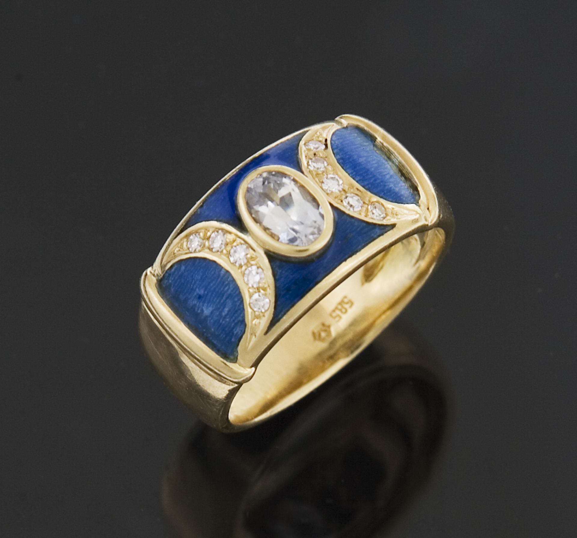 Gold enamel ring with white sapphire and diamonds. Victor Mayer, Pforzheim.