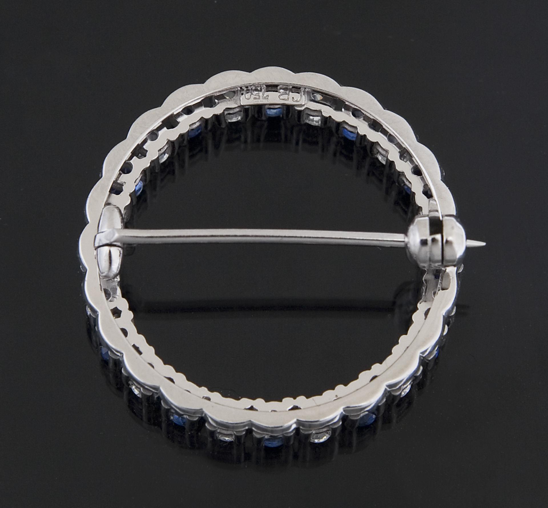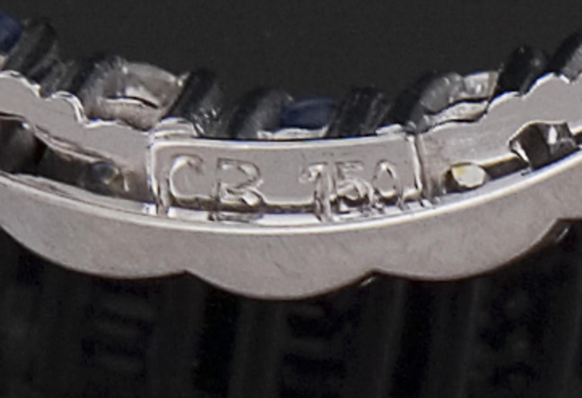 Alternating 10 small diamonds, 10 small sapphires in prong settings, simple timeless shape, hallmarks: Fineness, jeweler's mark CB.