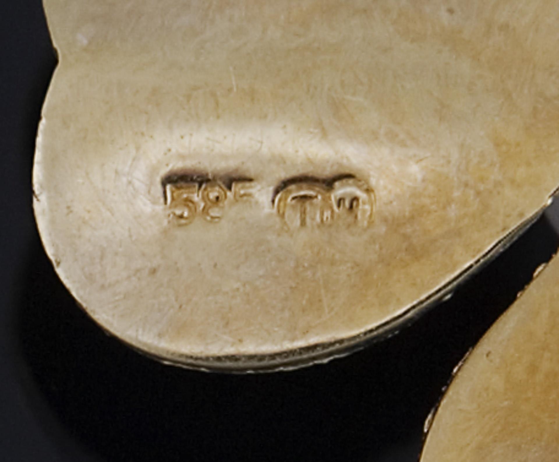Engraved four-leafed shape, hallmarks: Fineness, jeweler's mark.