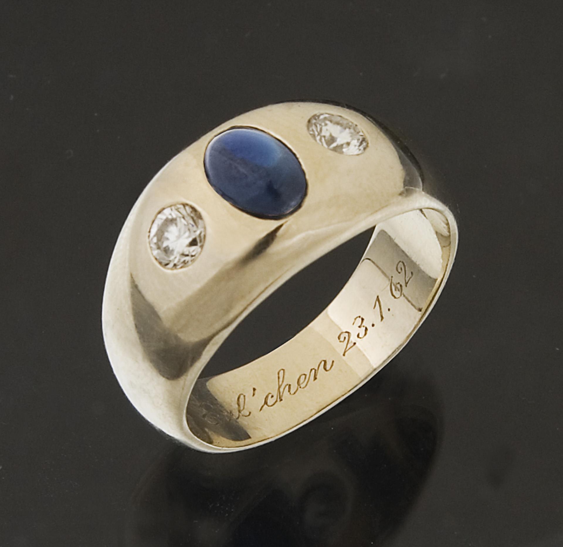 Oval sapphire cabochon approx. 7.5 x 5 mm, 2 diamonds each approx. 0.25 ct, together approx. 0.5 ct. Solidly worked, stable full rail. Hallmarks: Fineness, engraved dedication: "Eul'chen 23.01.(19)62".