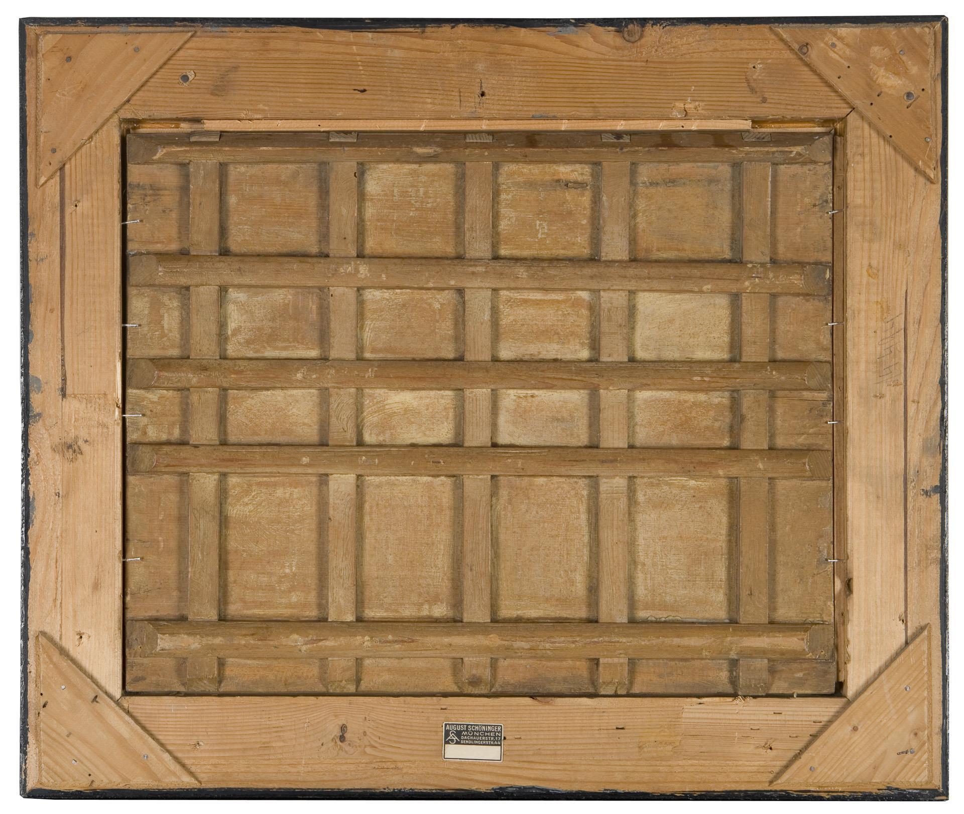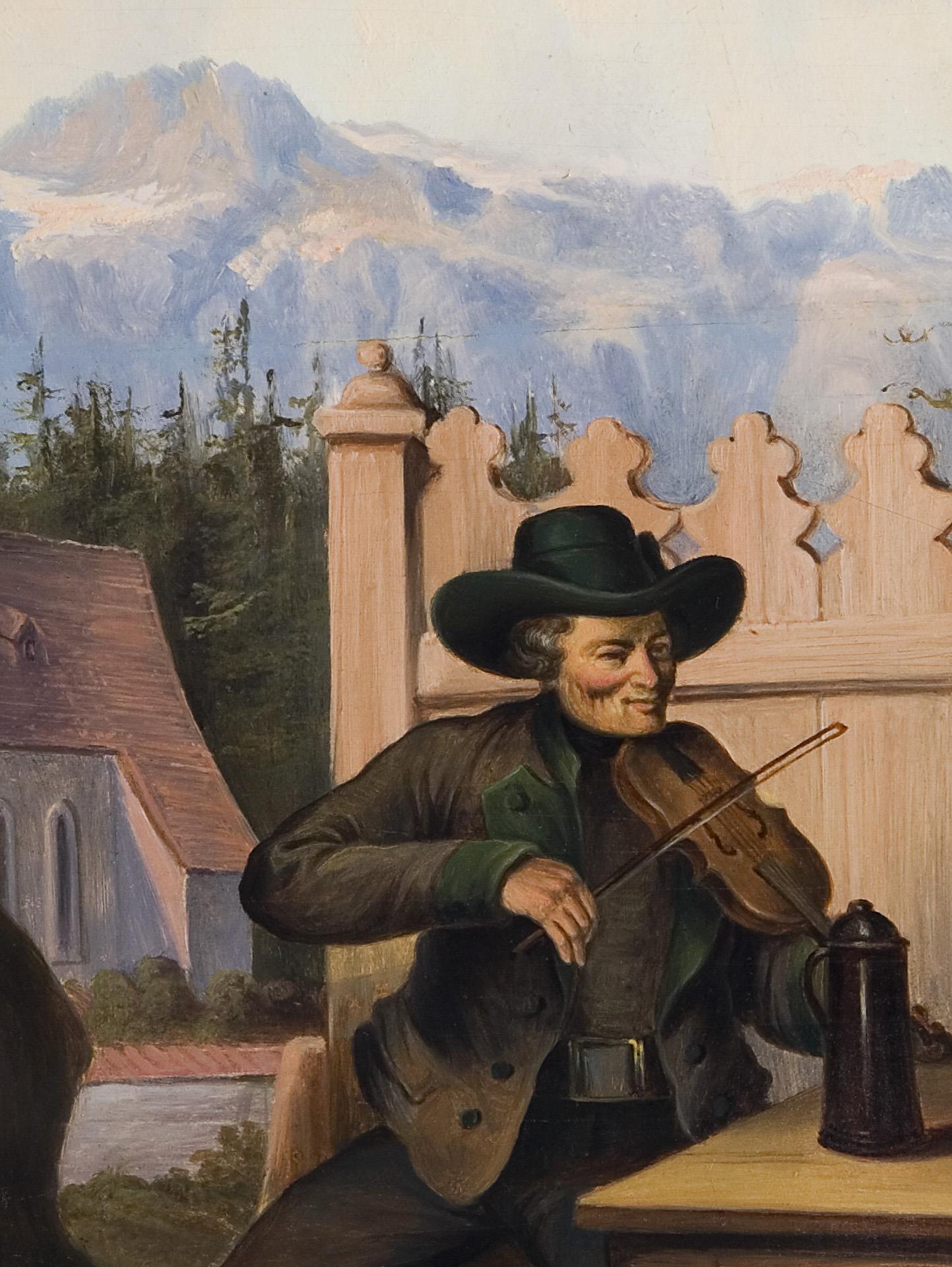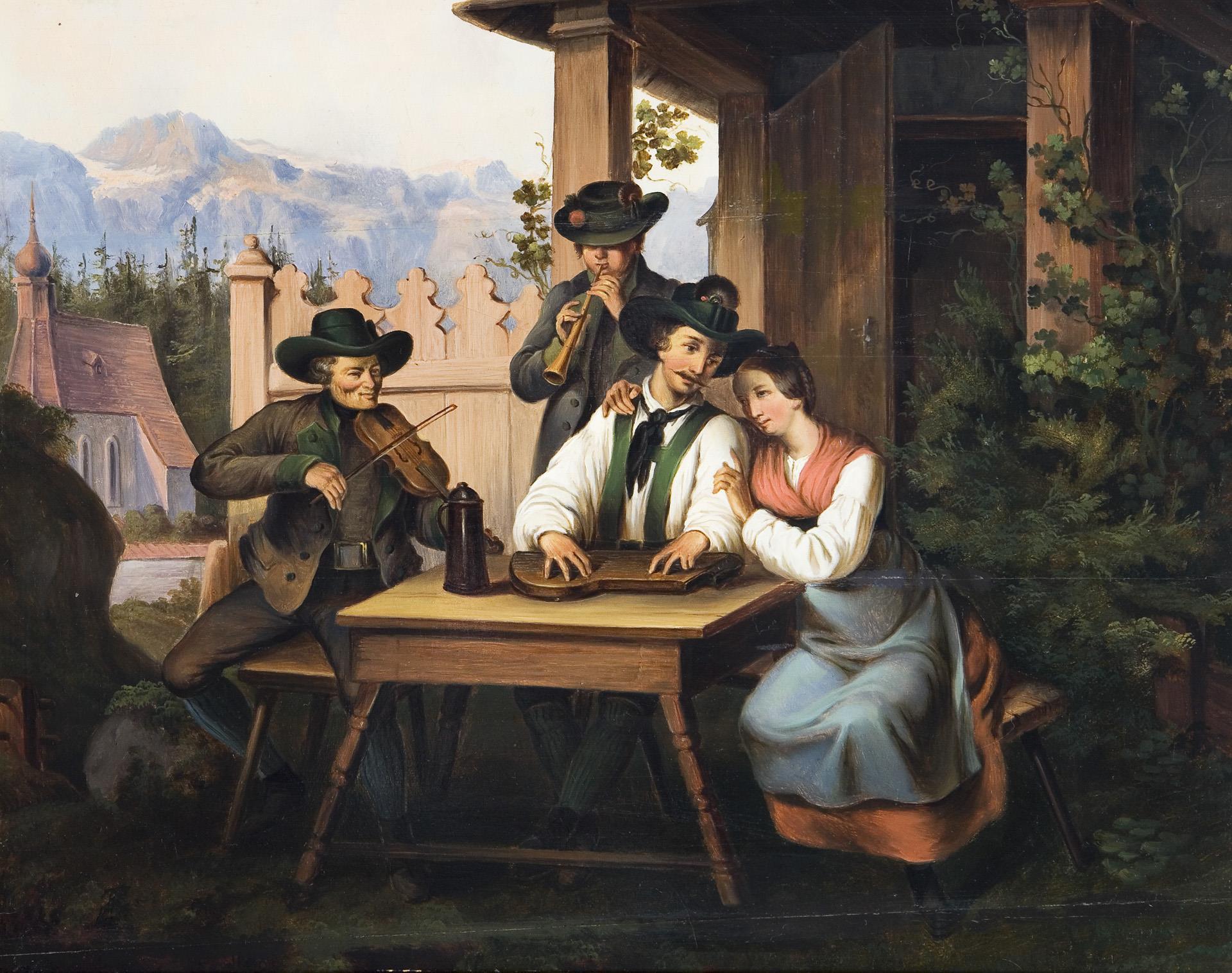Finely painted, endearingly contemplative genre scene from rural Tyrolean folk life. Profiled flambeau frame. Parquetry, two horizontal hairline cracks.