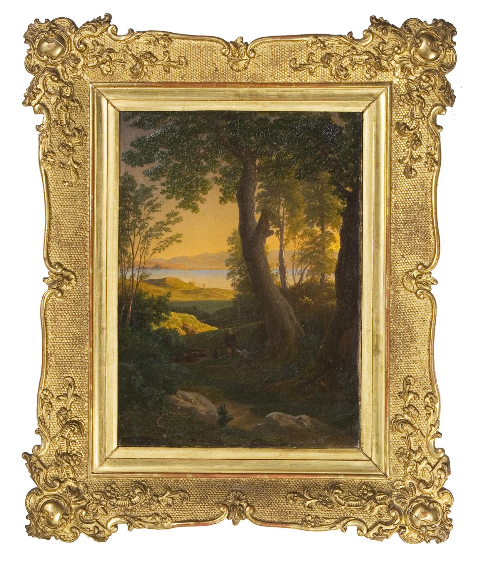 Romantic landscape detail, presumably on Lake Garda. The atmospheric deep motif in the sunset. Gilt stucco frame.