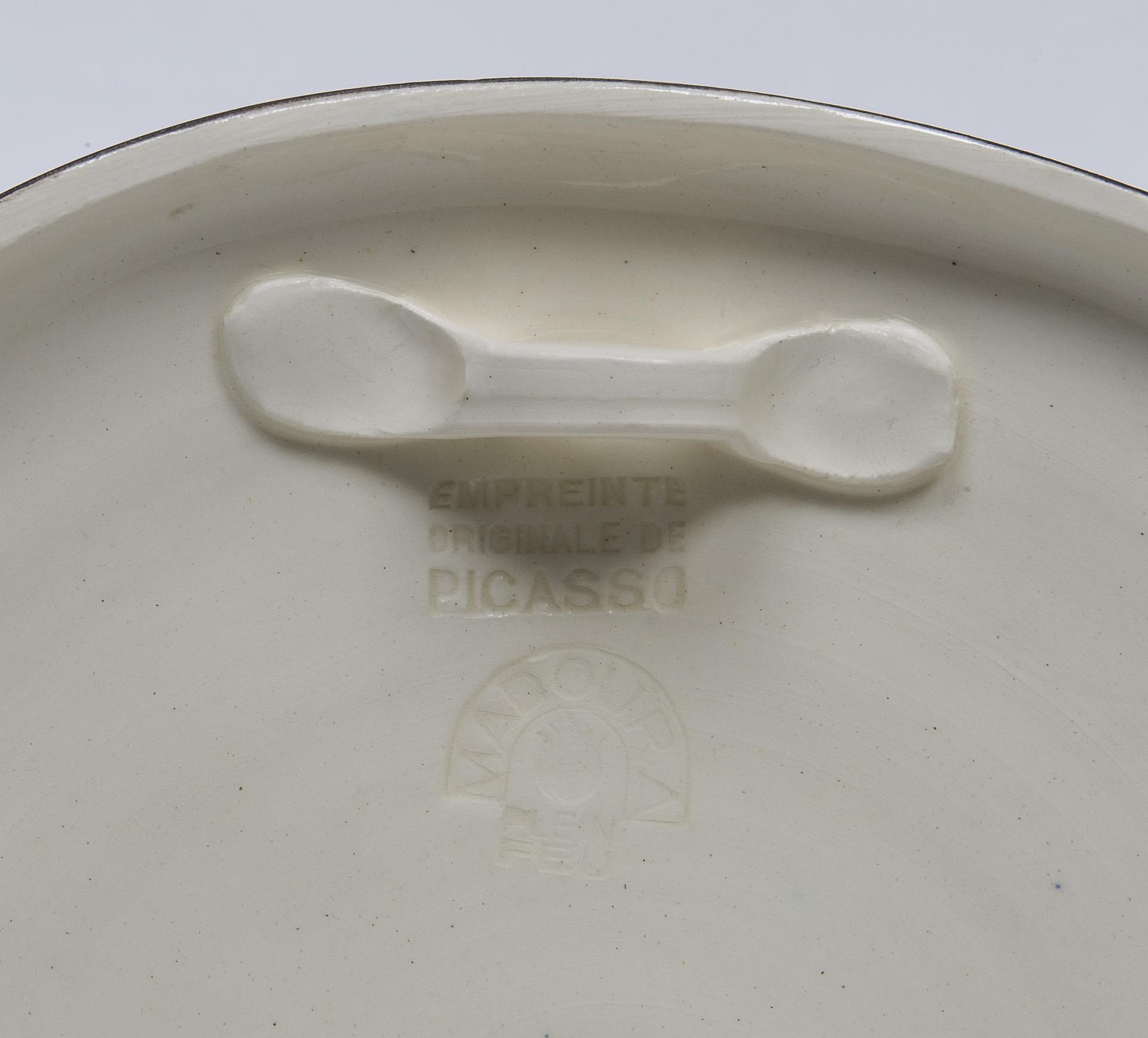 Ceramic 1956, pastose painting over a black matt ground. Cream-colored glaze on the reverse. Press mark: Empreinte Originale de Picasso, Madoura plein feu.