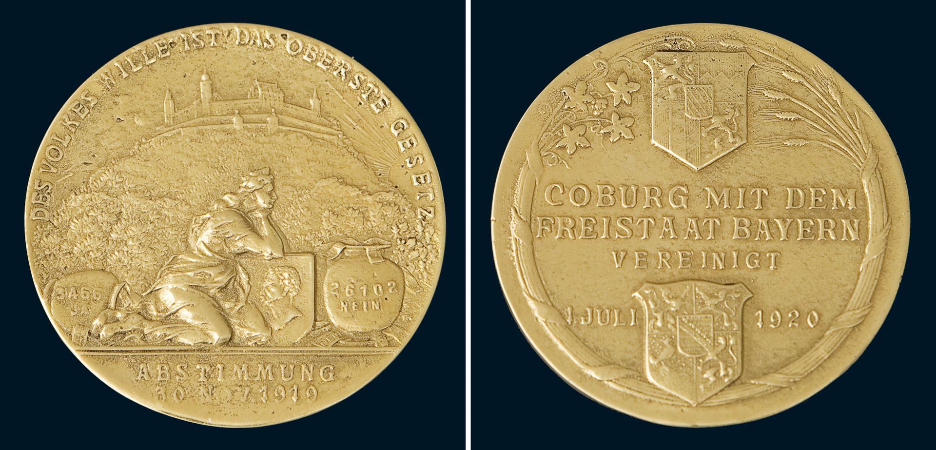 Reproduction of the commemorative medal from 1920. The medal commemorates Coburg's accession to Bavaria and the referendum on November 30, 1919, in which the annexation to Thüringen was rejected with 26102 no votes against 3466 yes votes. Writing above the Veste Coburg: "The will of the people is the supreme law". Lower right in the field ligated monogram FK (Fritz König, 1866 - after 1935, stamp cutter), in case.