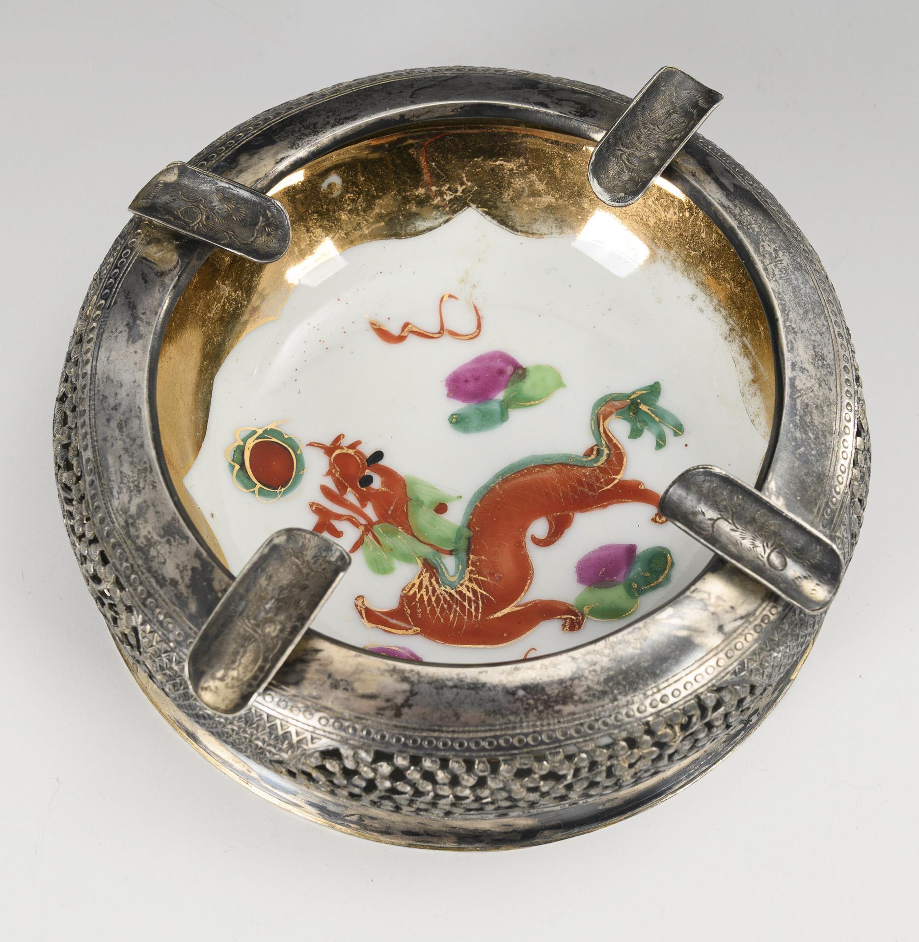 Ashtray with porcelain bowl, figural Fischer tea strainer with movable net, square vase in relief (dents and small defect to the stand), 2 lidded vessels with glass insert. Signs of use.