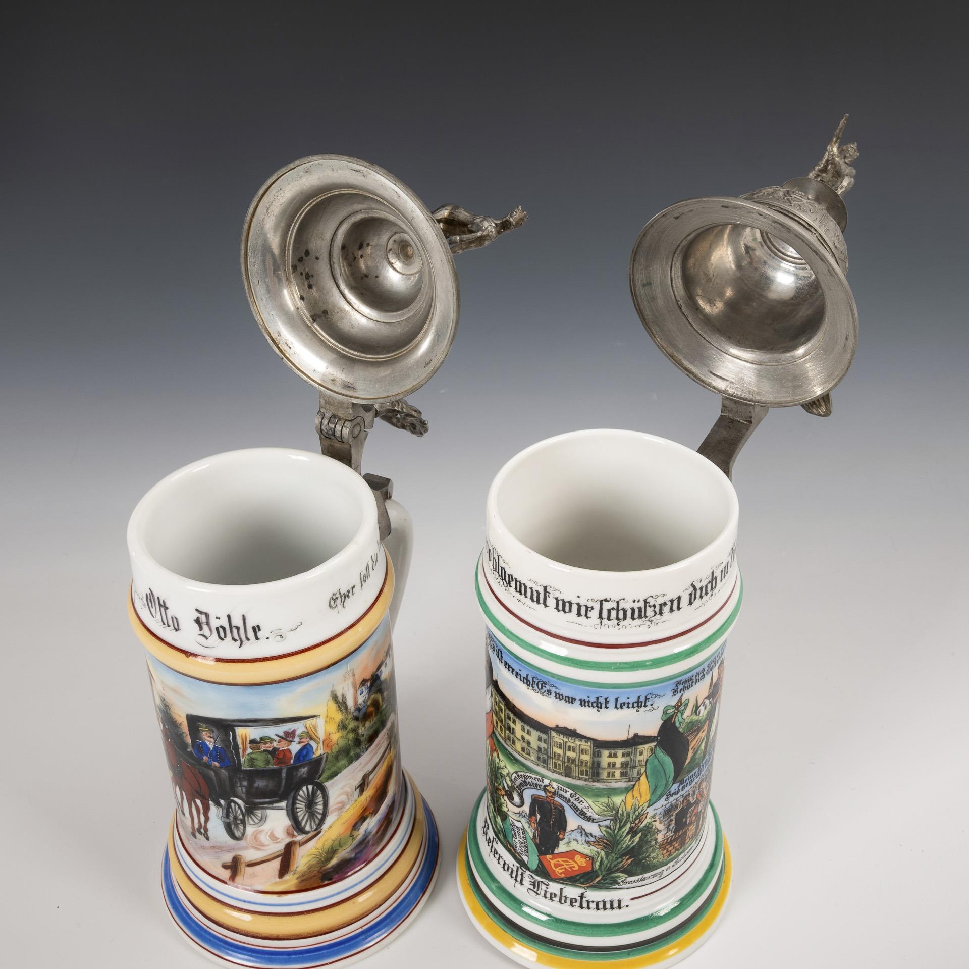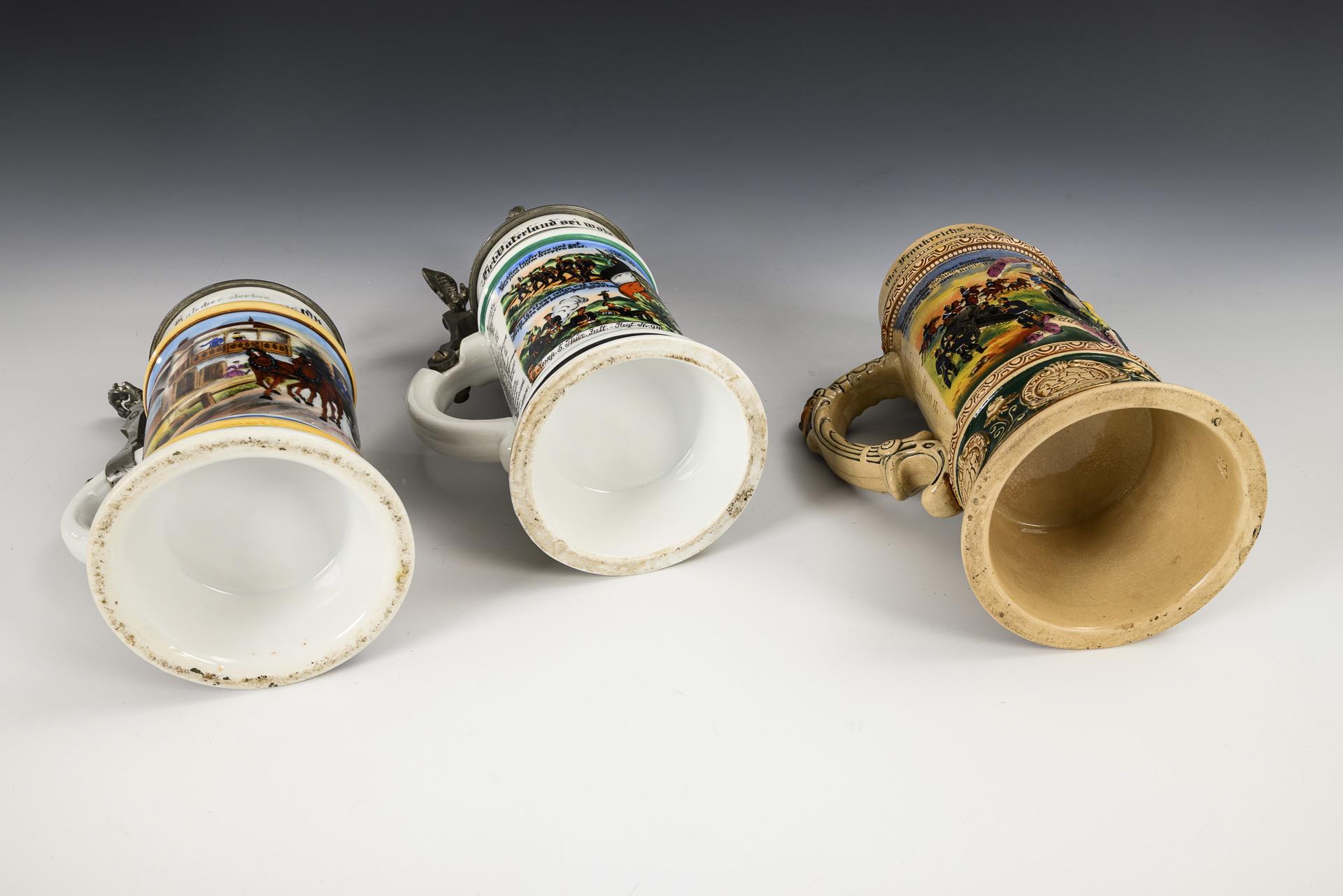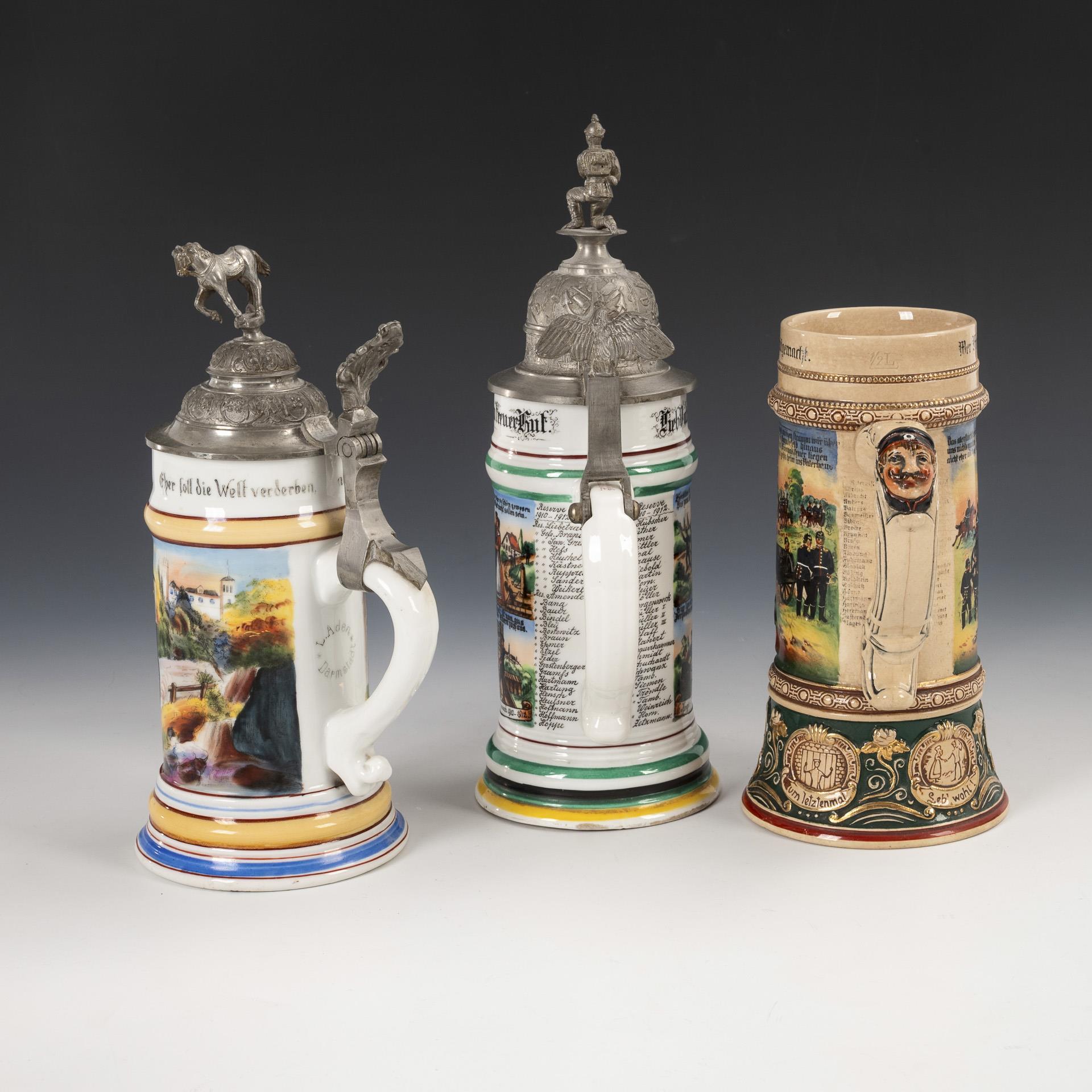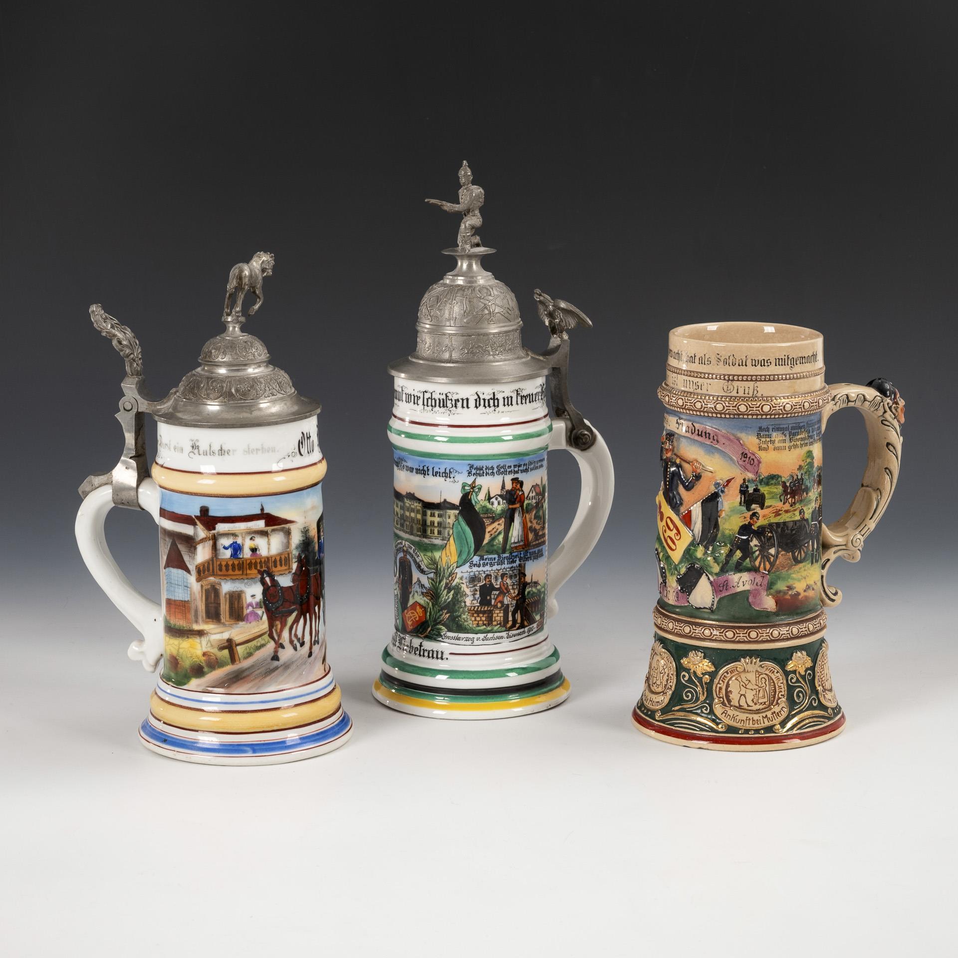 "Reservist Liebetrau, 6. Komp. 5. Thür. Inft.-Regt. no. 94. grand duke of Saxony. Eisenach 1910-1912". Standing soldier over shoulder piece, above barracks; flanked by military scenes and written list of names. Relief pewter lid with kneeling soldier and eagle pusher / Coachman's jug "Otto Döhle" with two horses and company in front of an inn. Pewter lid with horse figure and plant pusher / Relief ceramic jug without lid with central shoulder piece and soldier, written list of names. "Reservist Fladung, 1st Bttr. Feld Art. Rgt. No 69. St. Avold" (Lorraine). Sprue bar soldered, name list ceramic jug rubbed.