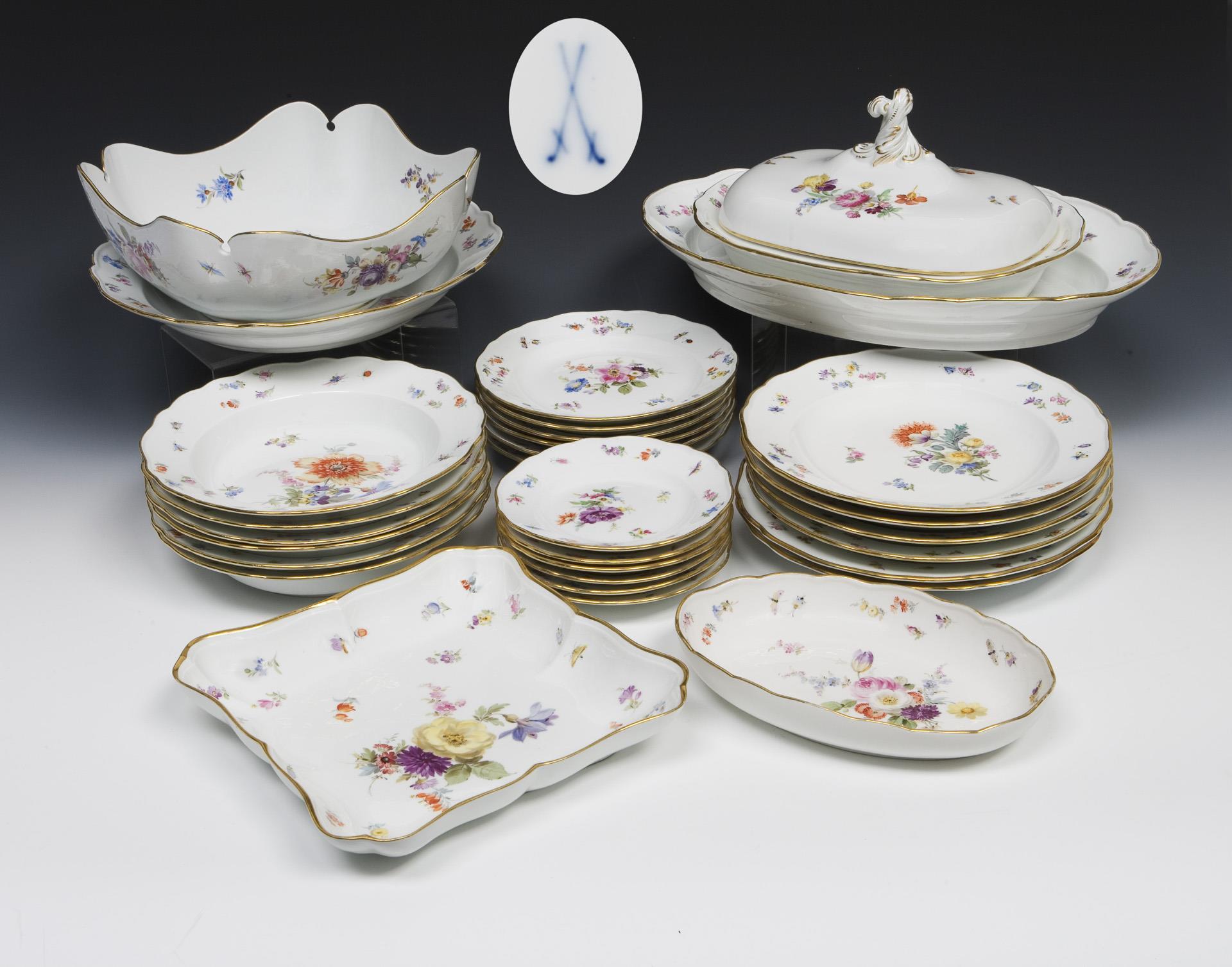 "New section" shape, painted in color, gold painted, "Flowers and insects" decoration. 30 pieces: 6 dinner plates, 6 soup plates, 6 large dessert plates, 6 small dessert plates, 1 square bowl, 1 oval bowl, 1 oval platter, 1 round platter, 1 lidded bowl, 1 square bowl. Press marks, saber marks, two dinner plates brush-stroked four times.